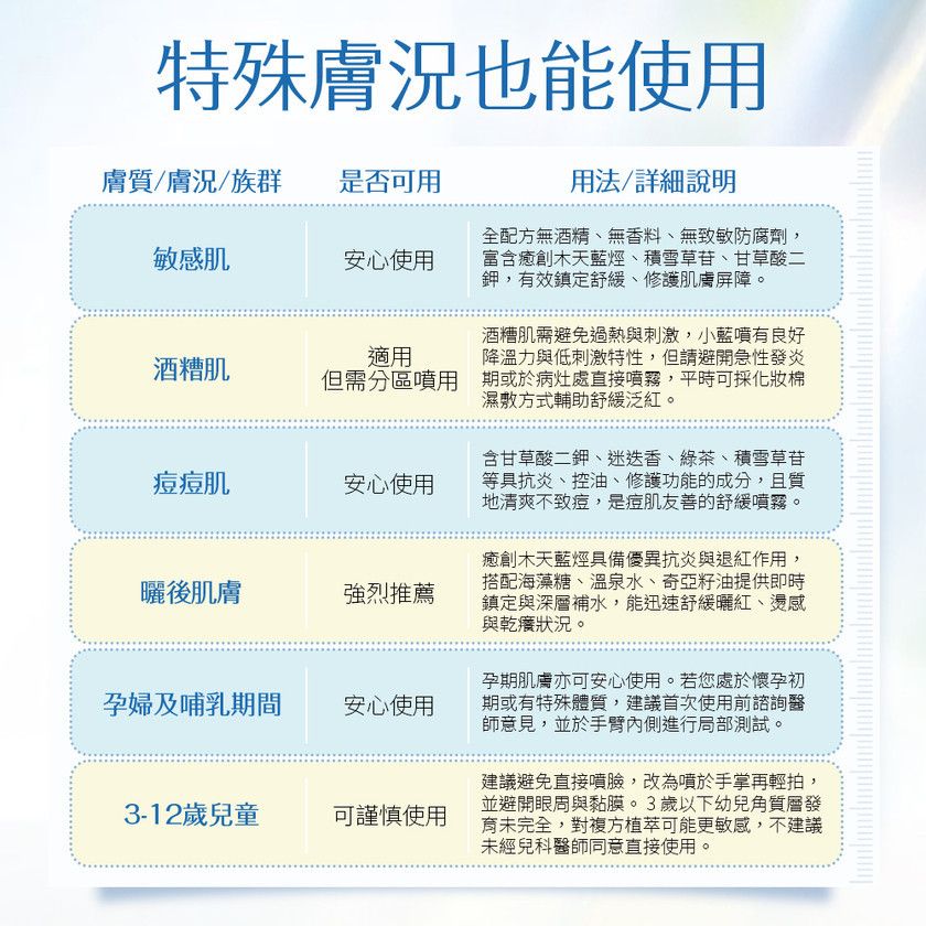 -癒創木天藍烴、富山溫泉水、積雪草等舒緩成分,一噴降溫修紅,緩解不適膚況