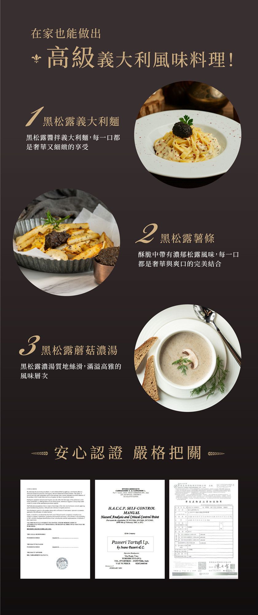 【黑松露風味橄欖油】 -使用冷壓初榨橄欖油,保留橄欖天然營養與香氣 -融合夏季黑松露(Tuber Aestivum Vitt),香氣層次豐富,提升料理質感 -適合淋在沙拉、義大利麵、燉飯或烤蔬菜,秒變高級餐桌 【黑松露鹽】 -採用來自地中海的天然海鹽,含豐富礦物質 -與黑松露碎融合,增添料理風味與獨特香氣 -搭配肉類、海鮮、蔬食都超對味,是健康料理調味品首選