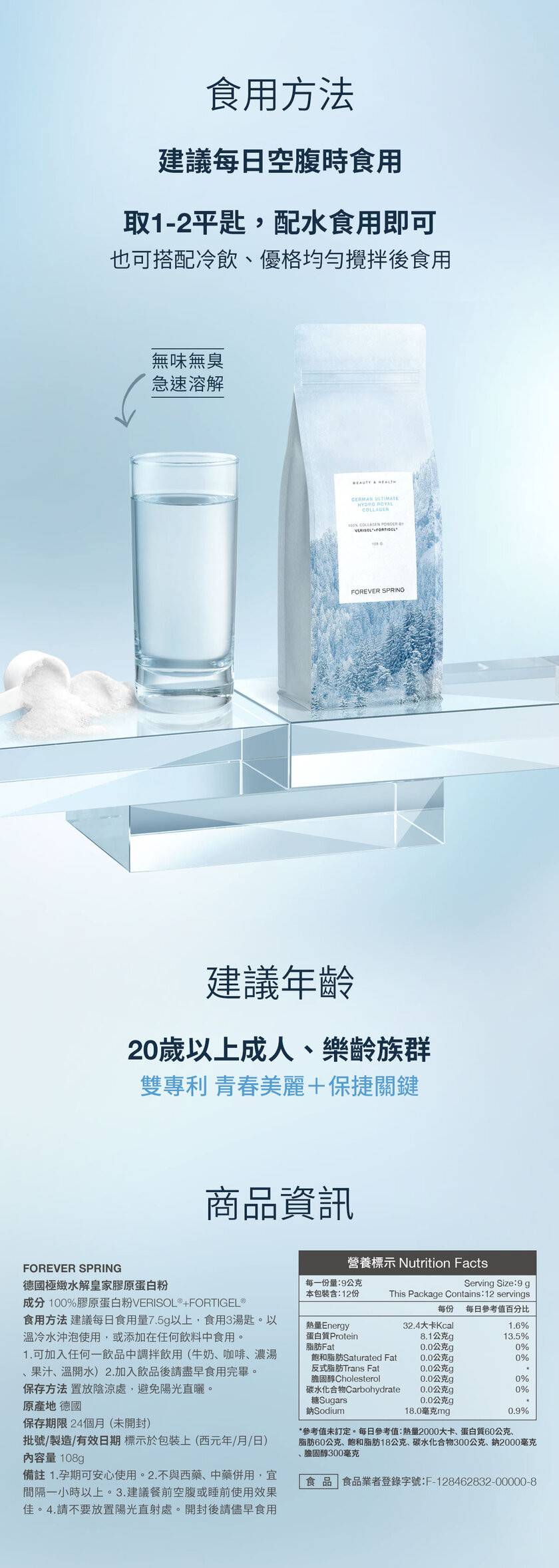 -專利製程技術,無臭無味、水解瞬溶 -0糖、0脂肪、0膽固醇、0麩質、0添加香料色素、0甜味劑、0防腐劑