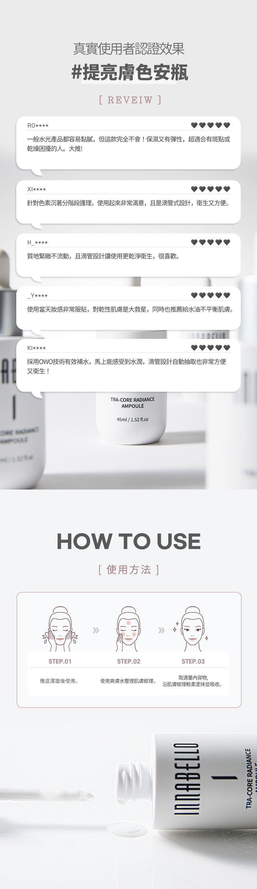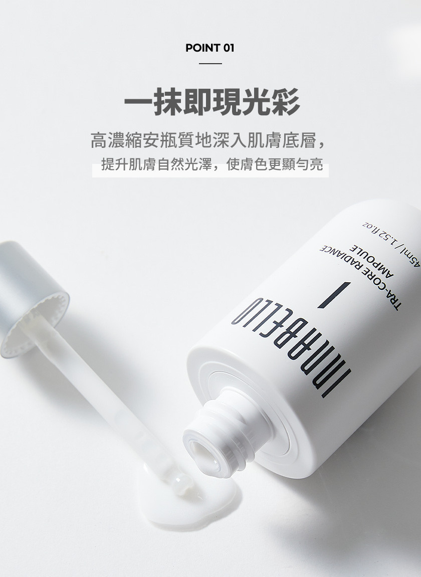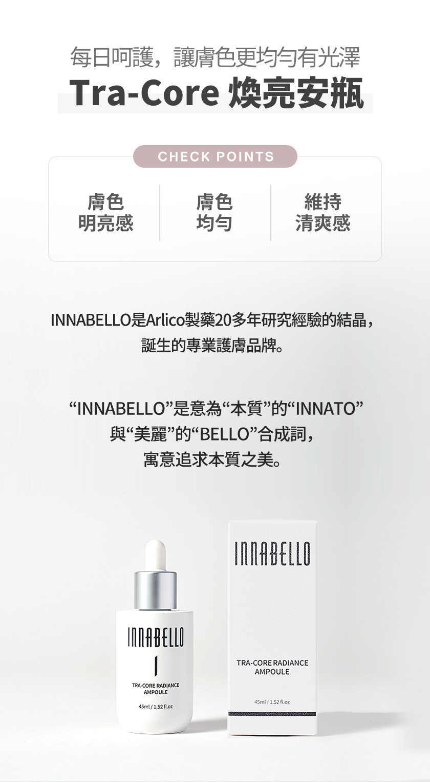 商品詳情 INNABELLO 煥亮安瓶 -添加熊果素、傳明酸與穀胱甘肽等亮膚保養成分 -搭配 OWO 導入技術,幫助保濕吸收、膚感清爽不黏膩 -配方溫和,使用者普遍回饋膚色更顯勻亮與光澤 🔴依消保法公告此為個人衛生用品,基於衛生考量無法接受退換,請同意再下單。 INNABELLO 煥亮安瓶 TWD $1,480 TWD$ 1,480