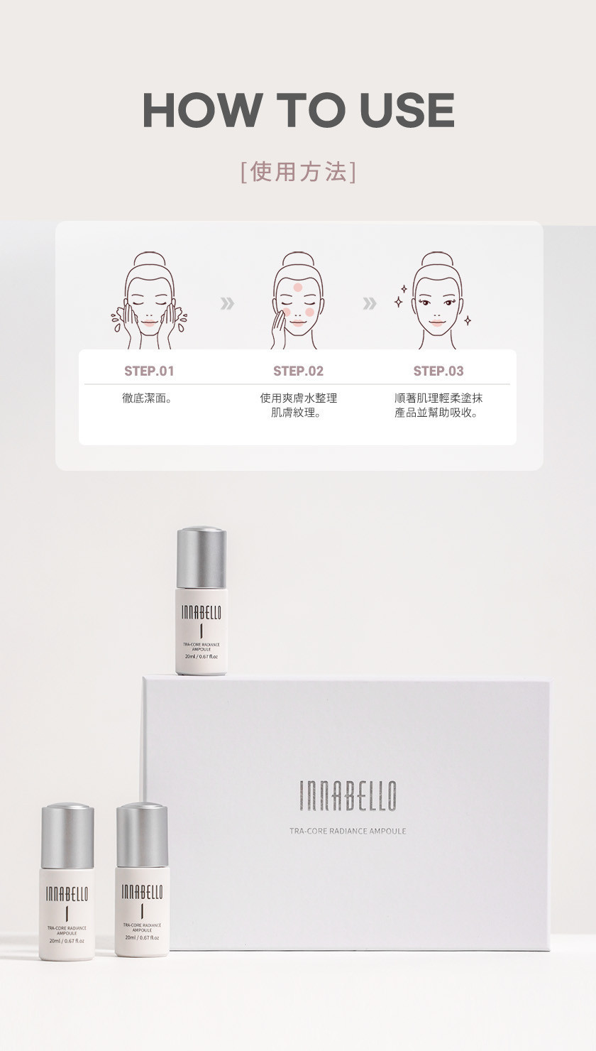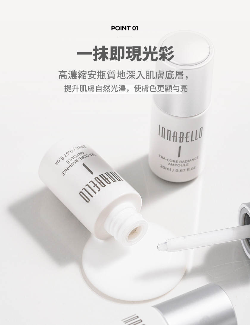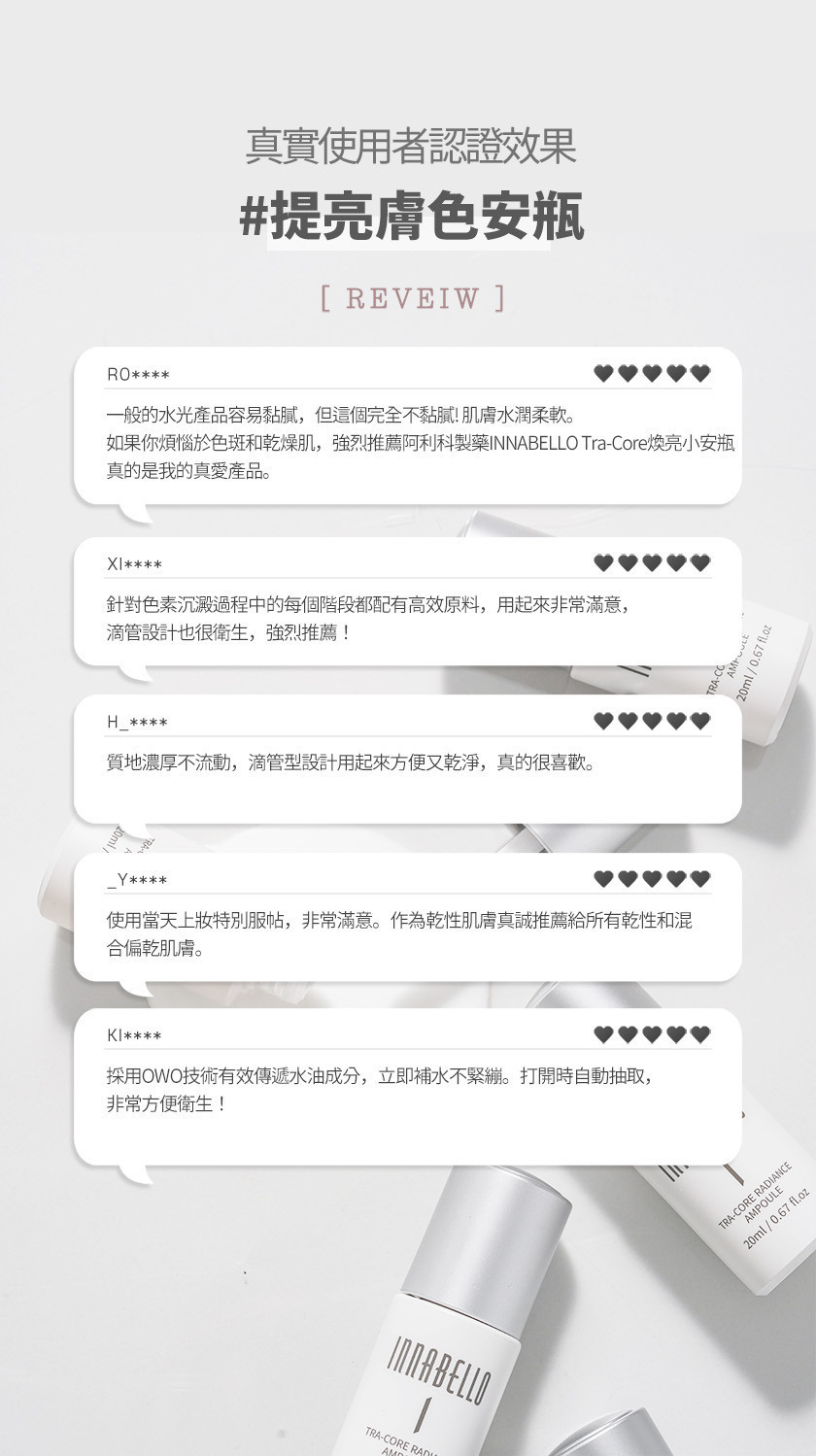 商品詳情 INNABELLO 煥亮小安瓶組 -添加熊果素、傳明酸與穀胱甘肽等亮膚保養成分 -搭配 OWO 導入技術,幫助保濕吸收、膚感清爽不黏膩 -配方溫和,使用者普遍回饋膚色更顯勻亮與光澤 🔴依消保法公告此為個人衛生用品,基於衛生考量無法接受退換,請同意再下單。 INNABELLO 煥亮小安瓶組 TWD $1,980 TWD$ 1,980