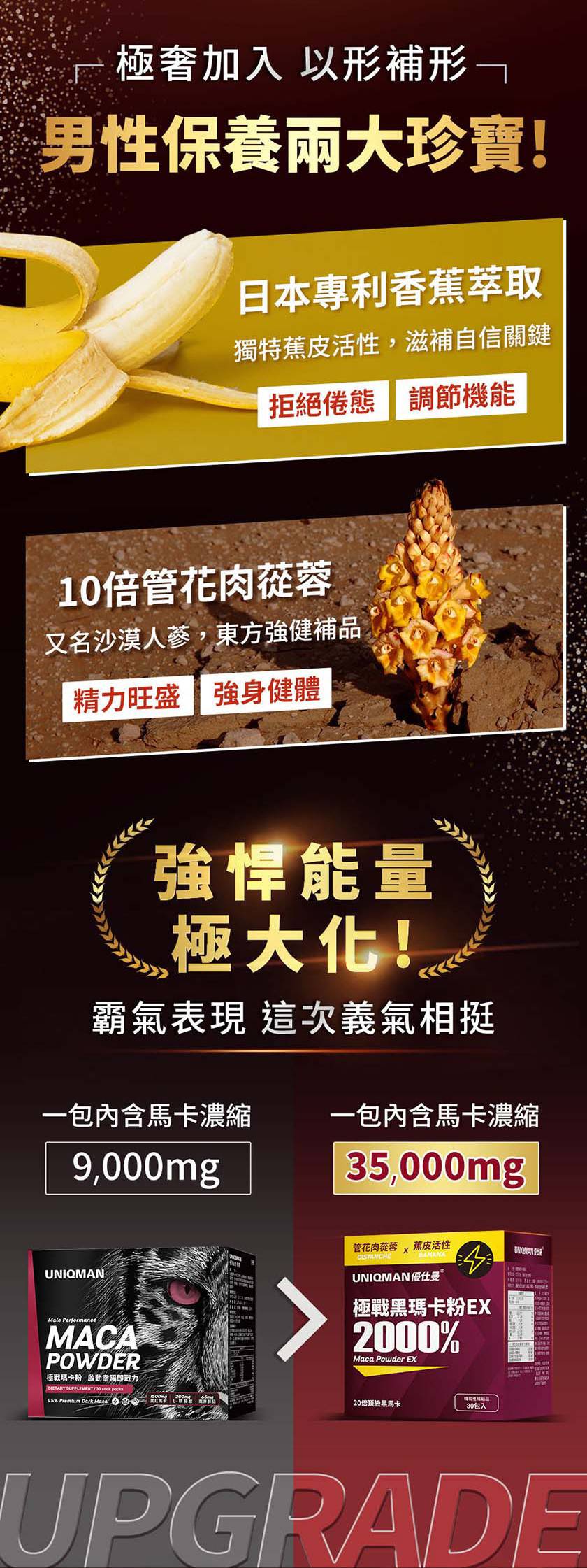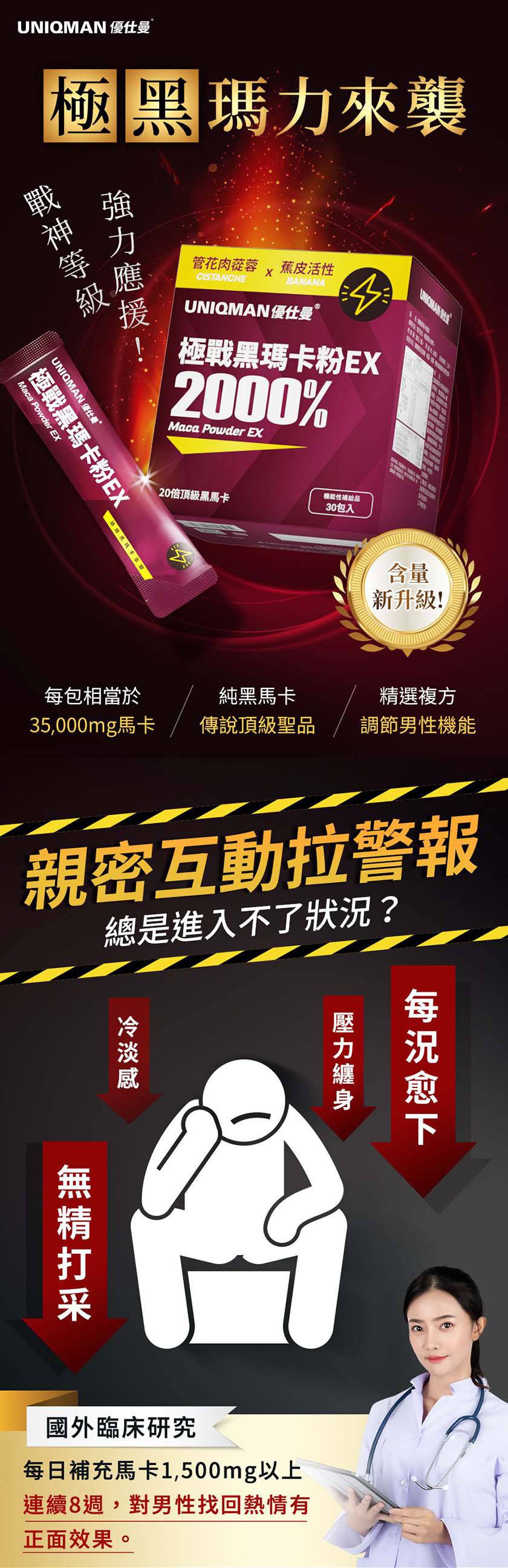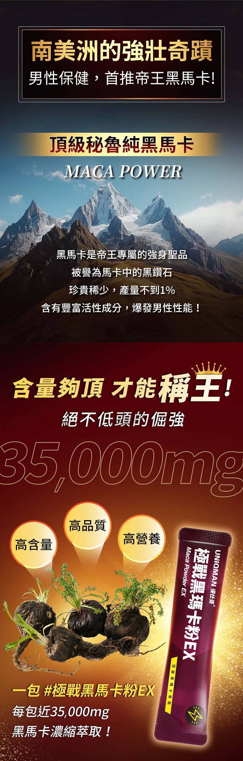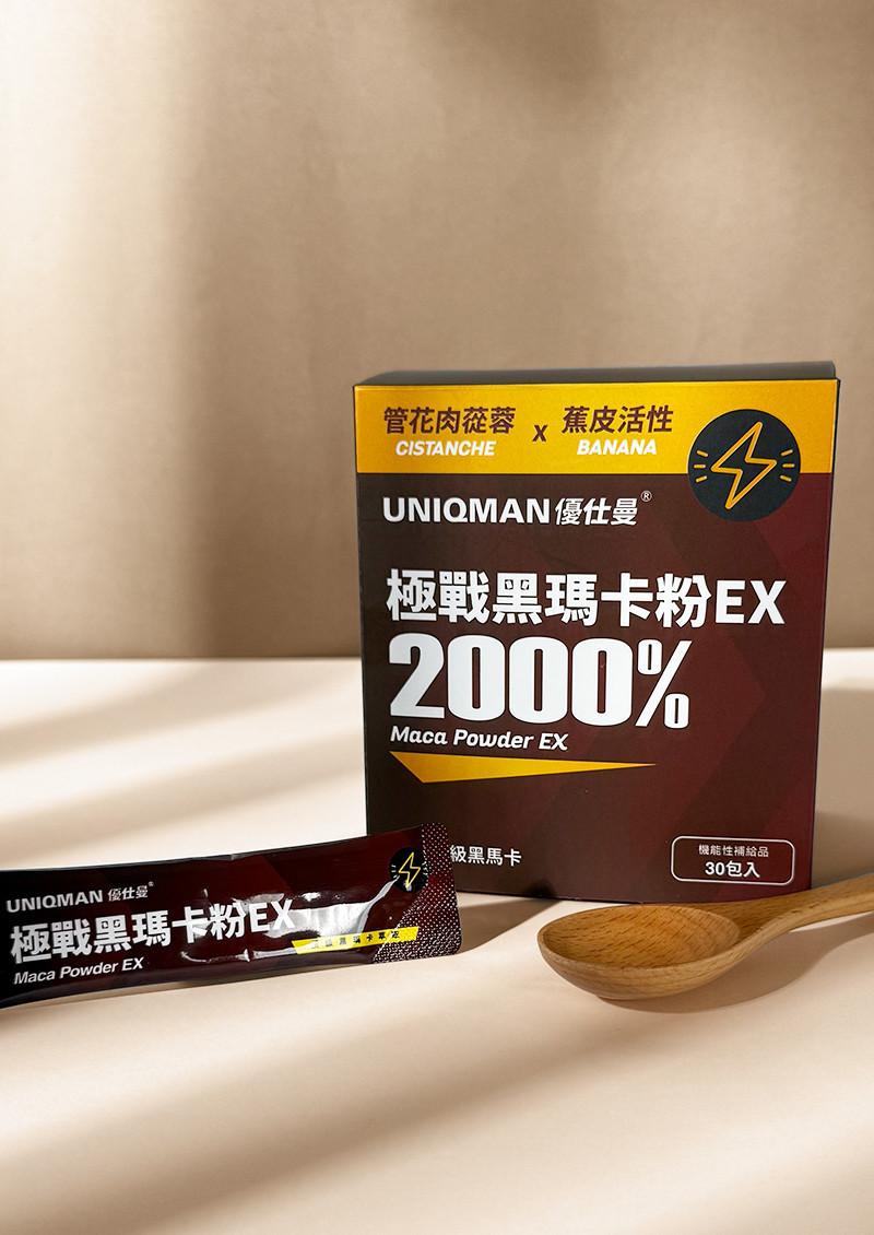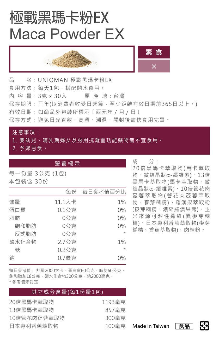 商品詳情 UNIQMAN 極戰黑瑪卡粉EX -每包含量相當於35,000mg黑馬卡濃縮 -夜間戰力:秘魯純黑馬卡,男性傳說頂級聖品,數量珍貴稀少 -機能調節:專利蕉皮活性因子,擁有日本專利,男性必備關鍵 -精力旺盛:管花肉蓯蓉,又稱沙漠人蔘,含豐富生物鹼等活性物質 UNIQMAN 極戰黑瑪卡粉EX TWD $990 TWD$ 990