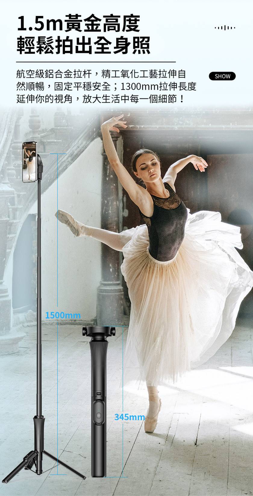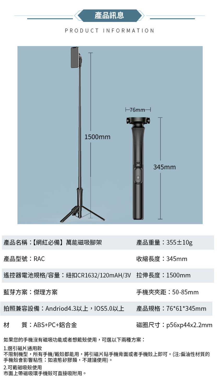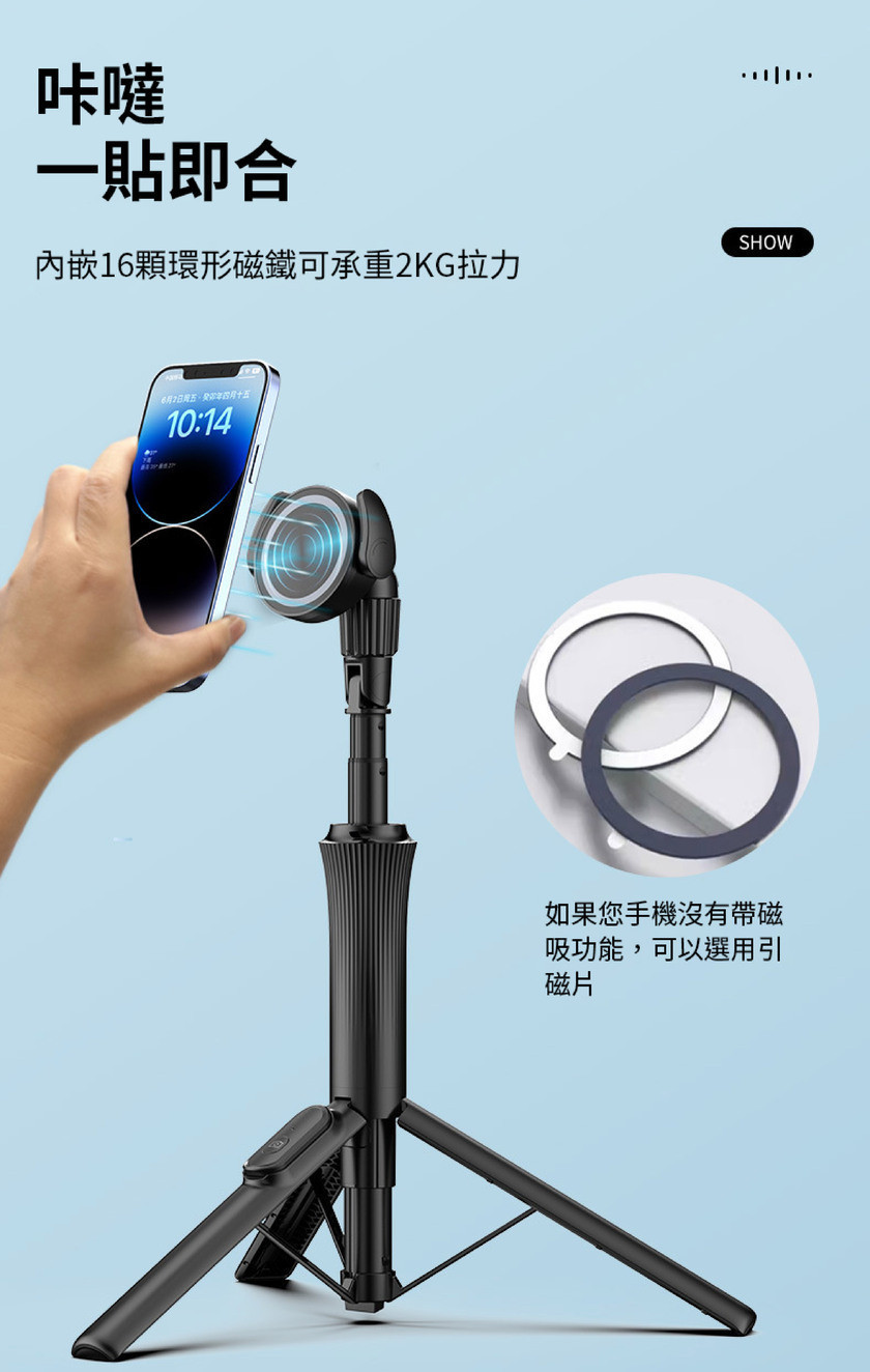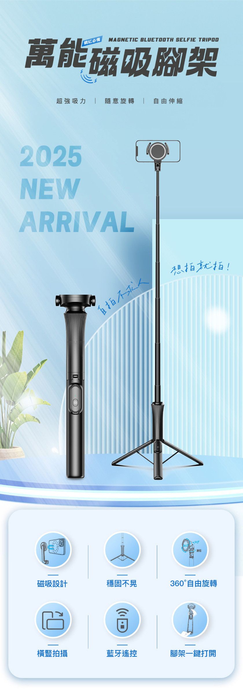 商品詳情 POK 萬能磁吸腳架 -穩固磁吸1秒吸上,穩固不怕掉落 -自由旋轉支架可調90度、磁吸360度旋轉 -伸縮自如最高長150cm,收回來又是自拍竿 -自動彈開腳架手拿、落地通通行 -藍牙遙控,遠端拍照錄影,自己也能出大片 POK 萬能磁吸腳架 TWD $990 TWD$ 990