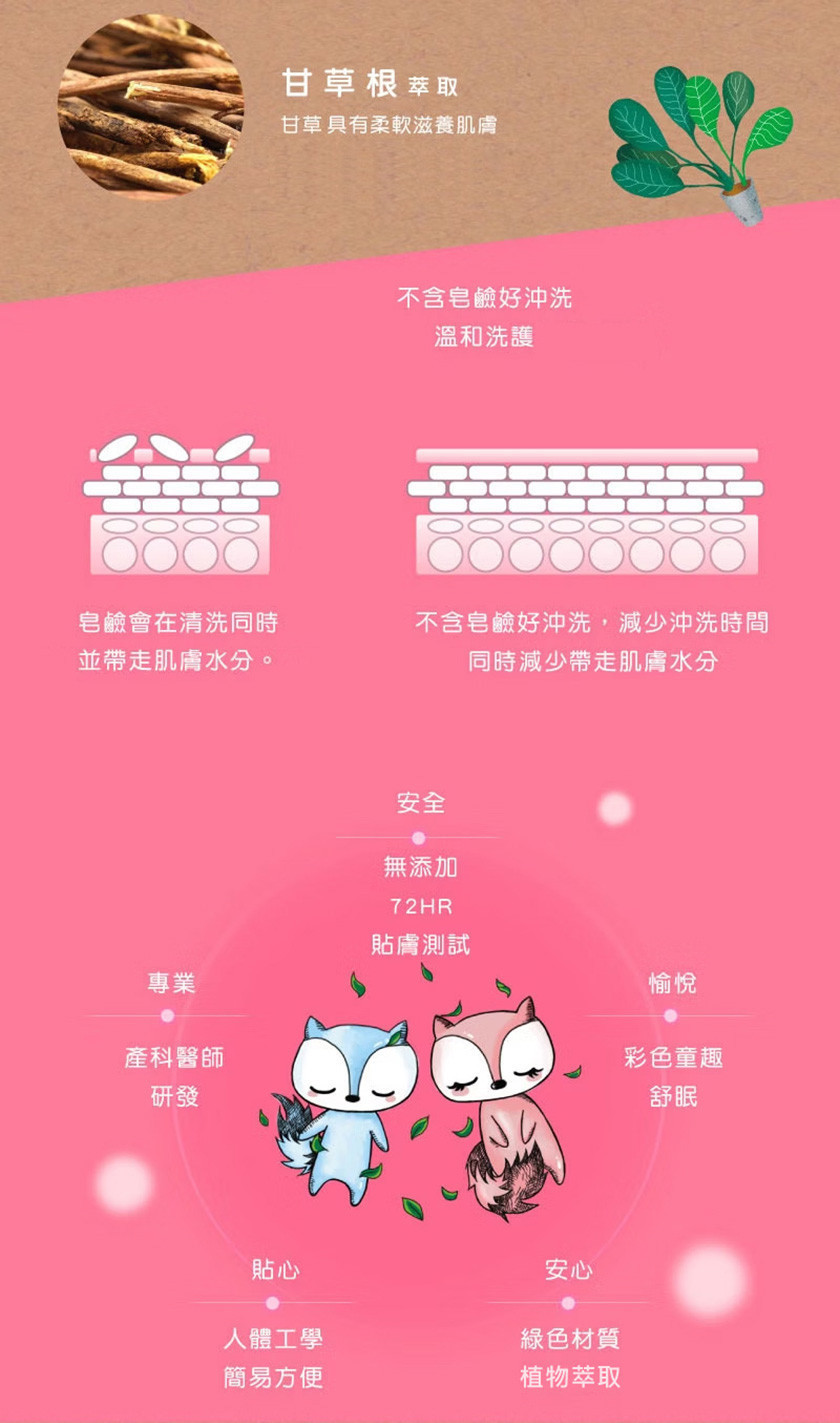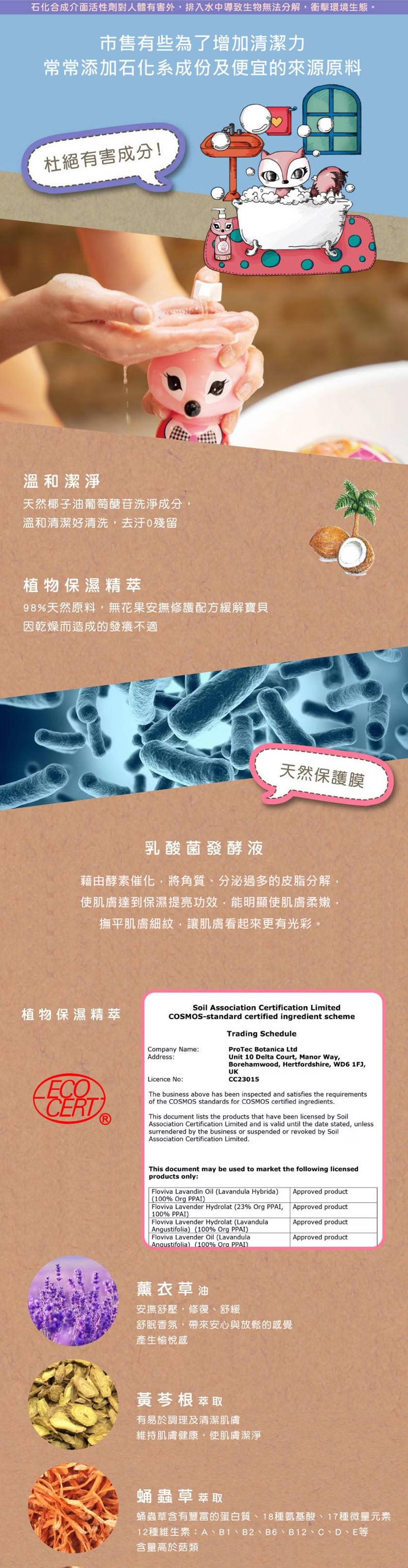 -椰子油葡萄醣苷洗淨成分,溫和清潔好清洗,去汙0殘留 -植物保濕精萃,無花果安撫修護配方緩解寶貝因乾燥而造成的發癢不適 -強化寶貝肌膚修復,荷荷芭油幫助抵抗外來皮膚刺激,舒緩肌膚 -薰衣草油,舒緩安撫寶貝,沐浴後幫助寶貝一夜好眠 -洗後肌膚柔嫩不乾澀,水嫩光滑伴有淡淡植物香氛