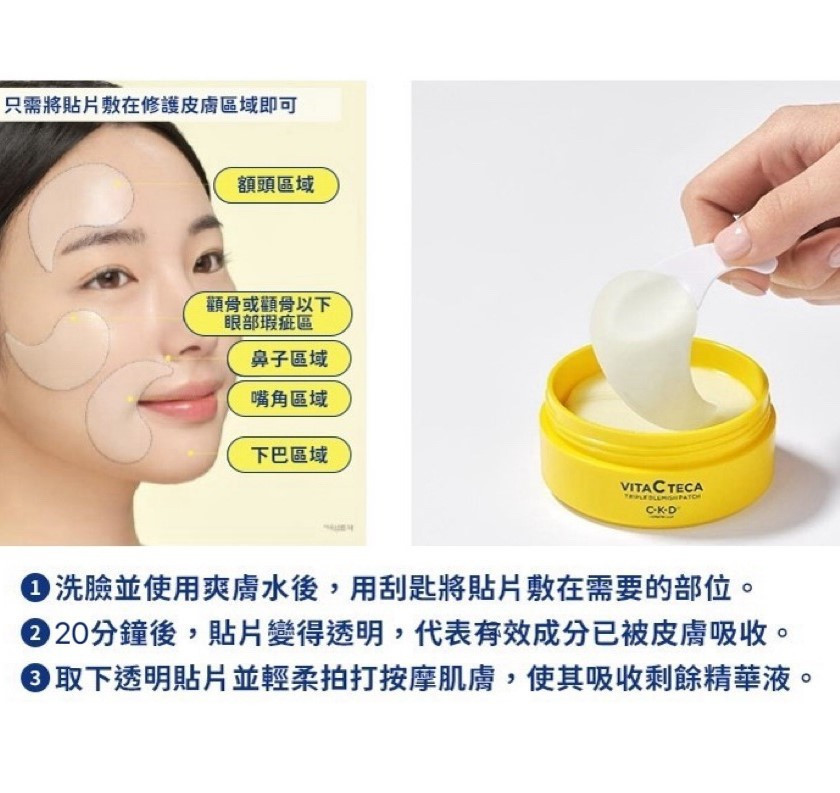 商品詳情 CKD VITA CTECA 維他命三重亮白肌膚貼片 -韓國原裝進口,難以忘懷的水嫩肌膚-比一般貼片大,可覆蓋大面積區域-緩解膚色不均勻產生的皮膚凹凸感-淡化改善肌膚暗沉 🔴依消保法公告此為個人衛生用品,基於衛生考量無法接受退換,請同意再下單。 CKD VITA CTECA 維他命三重亮白肌膚貼片 TWD $599 TWD$ 599