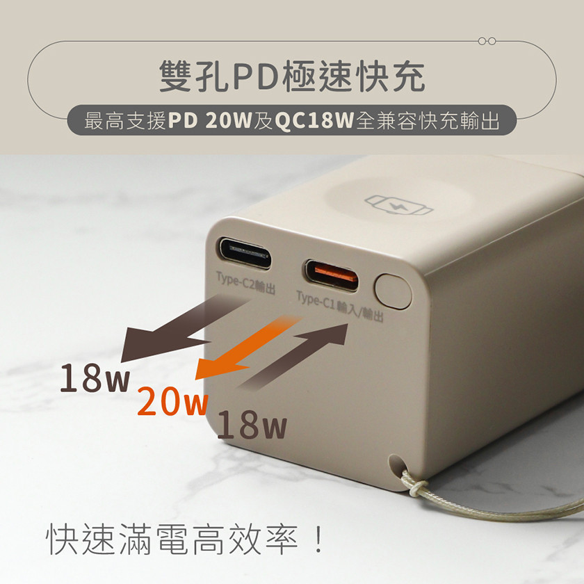 -Type-C雙孔PD/QC全兼容快充輸出,最高支援PD 20W及QC18W
