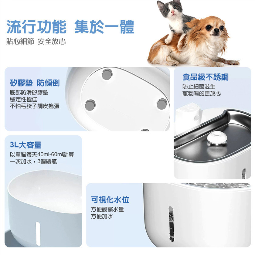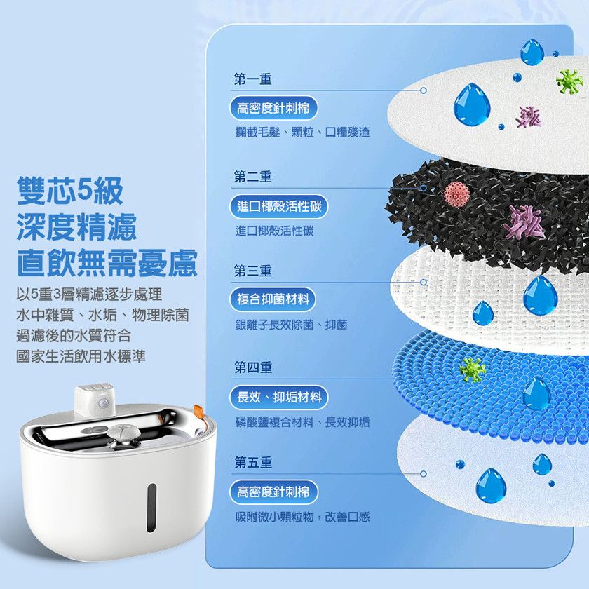 商品詳情 dudupet 寵物飲水機 -5重三層深度精濾,除菌率99.99% -睡眠級低噪模式,湧泉聲音低至35分貝 -3L大容量,加一次水可喝三週 -雙探測器360°全覆蓋,寵物靠近即自動感應出水 -超長續航,充一次電可用30-60天 dudupet 寵物飲水機 TWD $1,680 TWD$ 1,680