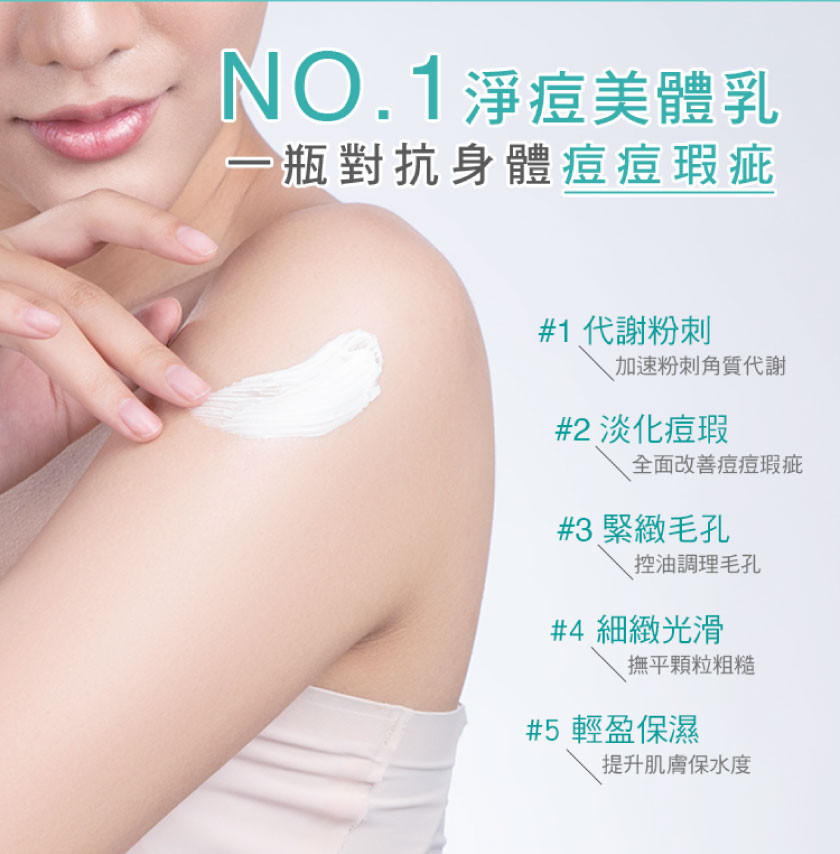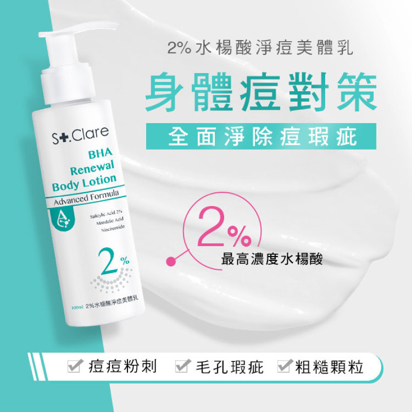 商品詳情 St.Clare聖克萊爾 2%水楊酸淨痘美體乳 -痘痘瑕疵OUT,高濃度2%水楊酸-杏仁酸加速煥膚,身體肌膚淨痘無瑕-煥膚、保濕、舒緩,肌質再進化-輕盈乳液質地,秒吸收、不黏膩-專治臀部粉刺、背部痘痘、手臂顆粒 🔴依消保法公告此為個人衛生用品,基於衛生考量無法接受退換,請同意再下單。 St.Clare聖克萊爾 2%水楊酸淨痘美體乳 TWD $549 TWD$ 549
