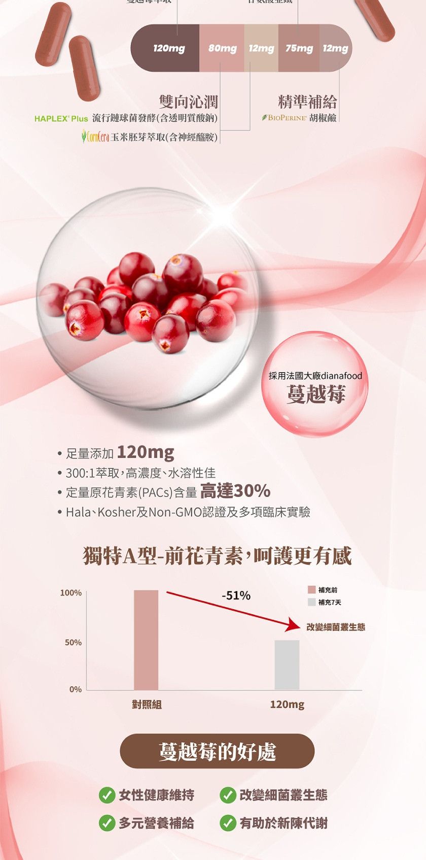 -CRANPURE蔓越莓萃取,原花青素足量添加,維持清爽舒暢,女性呵護關鍵