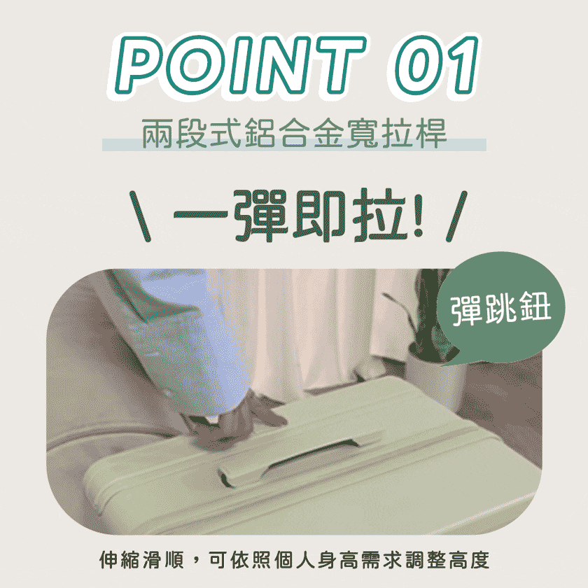 -全鋁寬拉桿一彈即拉,平衡省力、釋放箱內20%+空間