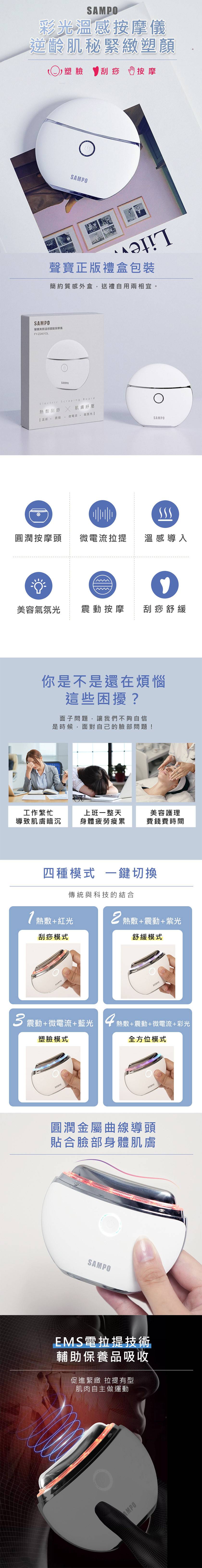 商品詳情 SAMPO聲寶 緊緻美顏溫感震動按摩儀 -42度熱敷震動按摩 -三色彩光紓壓-EMS微電流導入-圓潤貼敷按摩頭 🔴依消保法公告此為個人衛生用品,基於衛生考量無法接受退換,請同意再下單 SAMPO聲寶 緊緻美顏溫感震動按摩儀 TWD $988 TWD$ 988