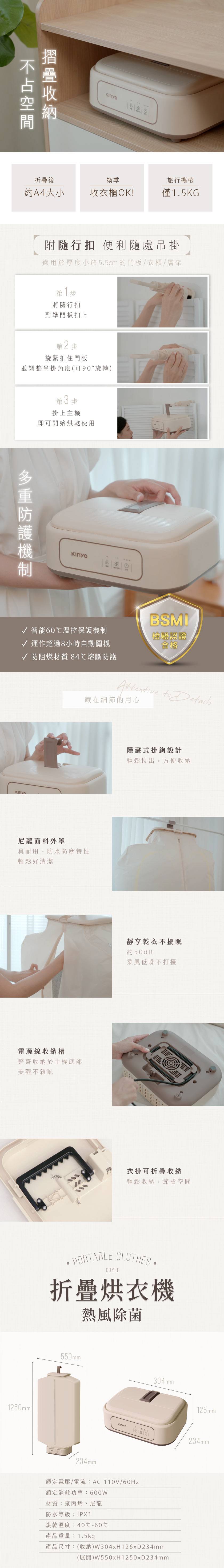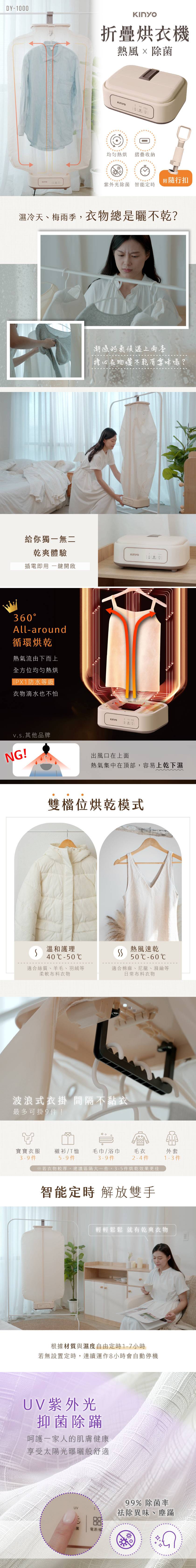商品詳情 KINYO 熱風除菌折疊烘衣機 -40-60℃溫暖熱風烘乾 -護理、速乾兩檔模式 -UV紫外光除菌抑味 -可收納折疊設計,超便攜 -1-7小時定時功能,免守候 -附隨行扣,便利隨處吊掛 -安全60℃溫控保護機制 -工作逾8小時自動關機 -阻燃材質,84℃熔斷防護 KINYO 熱風除菌折疊烘衣機 TWD $2,280 TWD$ 2,280