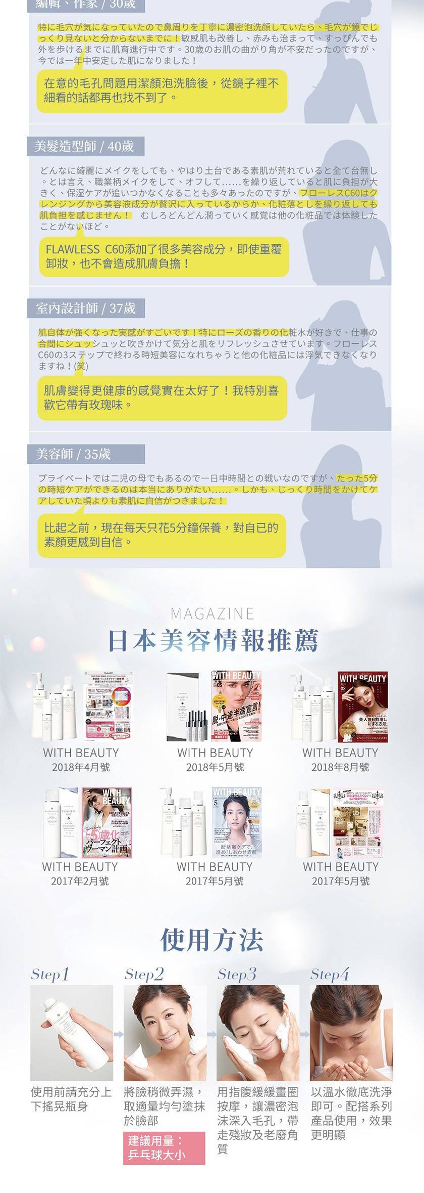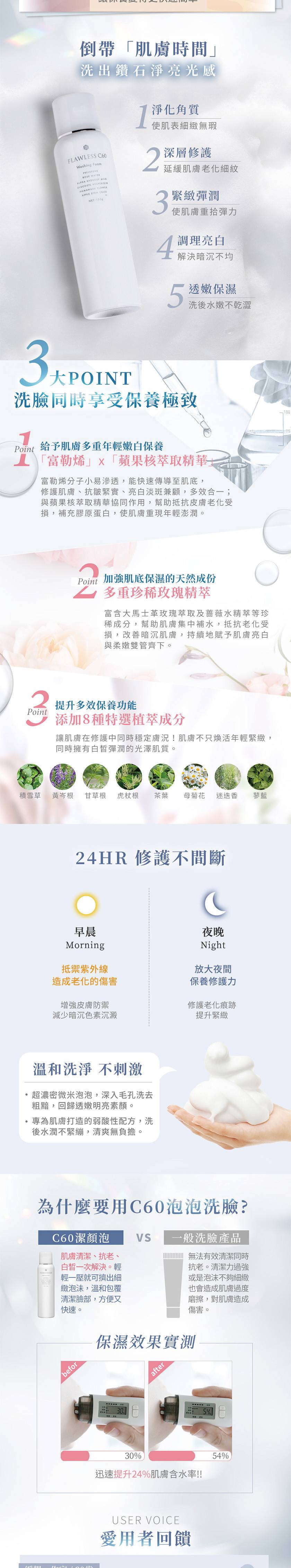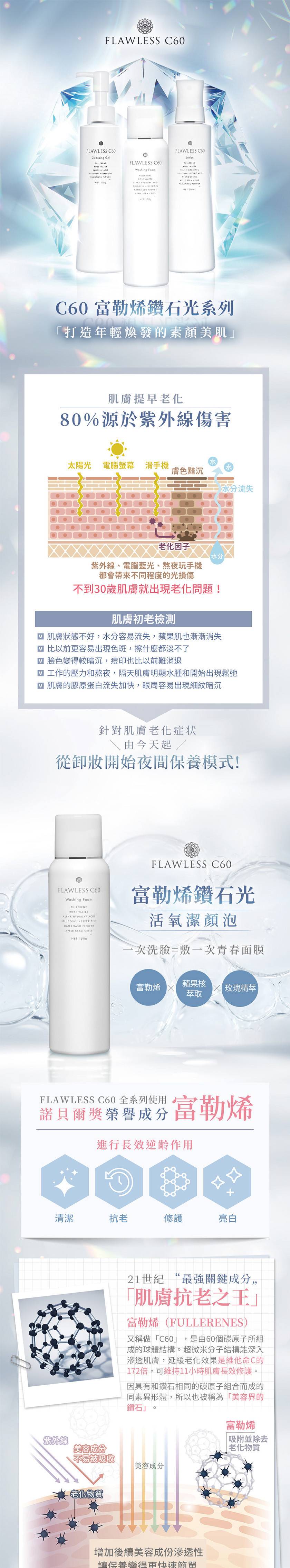 商品詳情 FLAWLESS C60富勒烯鑽石光活氧潔面泡沫慕斯 -清潔肌膚,洗去肌表與深層髒污 -淨化角質,使膚觸柔滑細緻 -延緩老化,維持膚質緊實彈性 -潤澤保濕,洗後水嫩不乾澀-調理亮白,勻透明亮膚感 🔴依消保法公告此為個人衛生用品,基於衛生考量無法接受退換,請同意再下單。 FLAWLESS C60富勒烯鑽石光活氧潔面泡沫慕斯 TWD $799 TWD$ 799