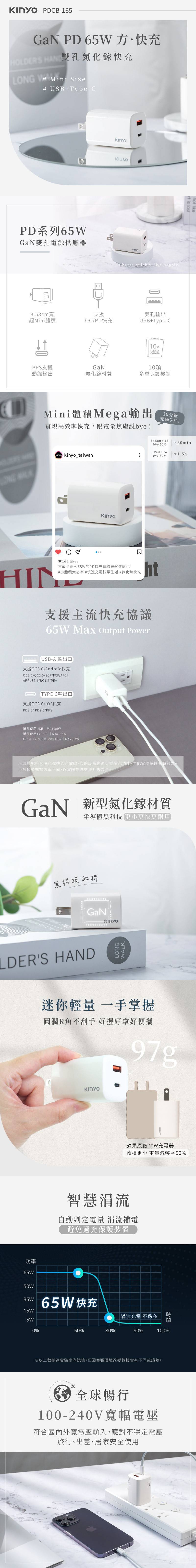 KINYO 氮化鎵雙孔PD充電器65W