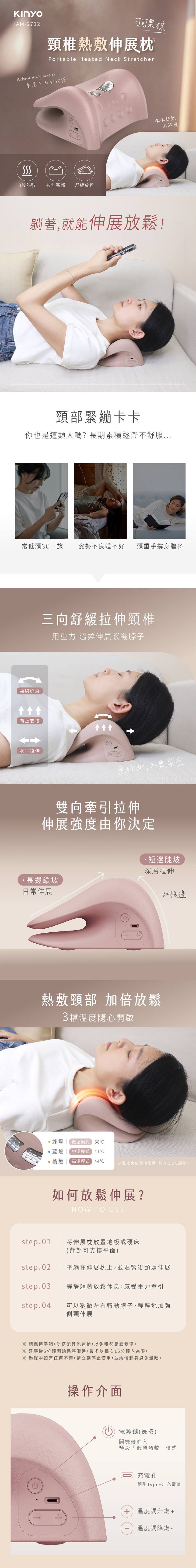 商品詳情 KINYO 頸椎熱敷伸展枕 -舒服:輕鬆躺著即可舒展放鬆,最簡單-拉伸:雙向高低角度,可深可淺牽引拉伸-重力:透過自然重力牽引,非外力更安心-貼合:C型曲線,完美貼合頸部更舒適-熱敷:38℃/41℃/44℃,3段熱敷舒緩-支撐:材質穩固有彈性,有效支撐頸椎 🔴依消保法公告此為個人衛生用品,基於衛生考量無法接受退換,請同意再下單。 KINYO 頸椎熱敷伸展枕 TWD $1,190 TWD$ 1,190