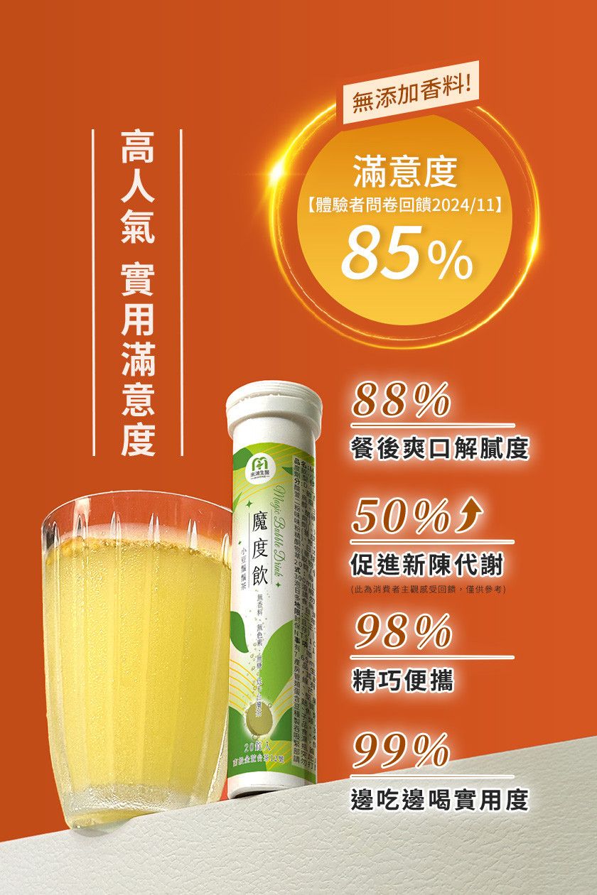 -消費者實測85%滿意度(餐後爽口解膩、促進新陳代謝、邊吃邊喝相當實用、攜帶超方便),是消費者心中的高CP值產品