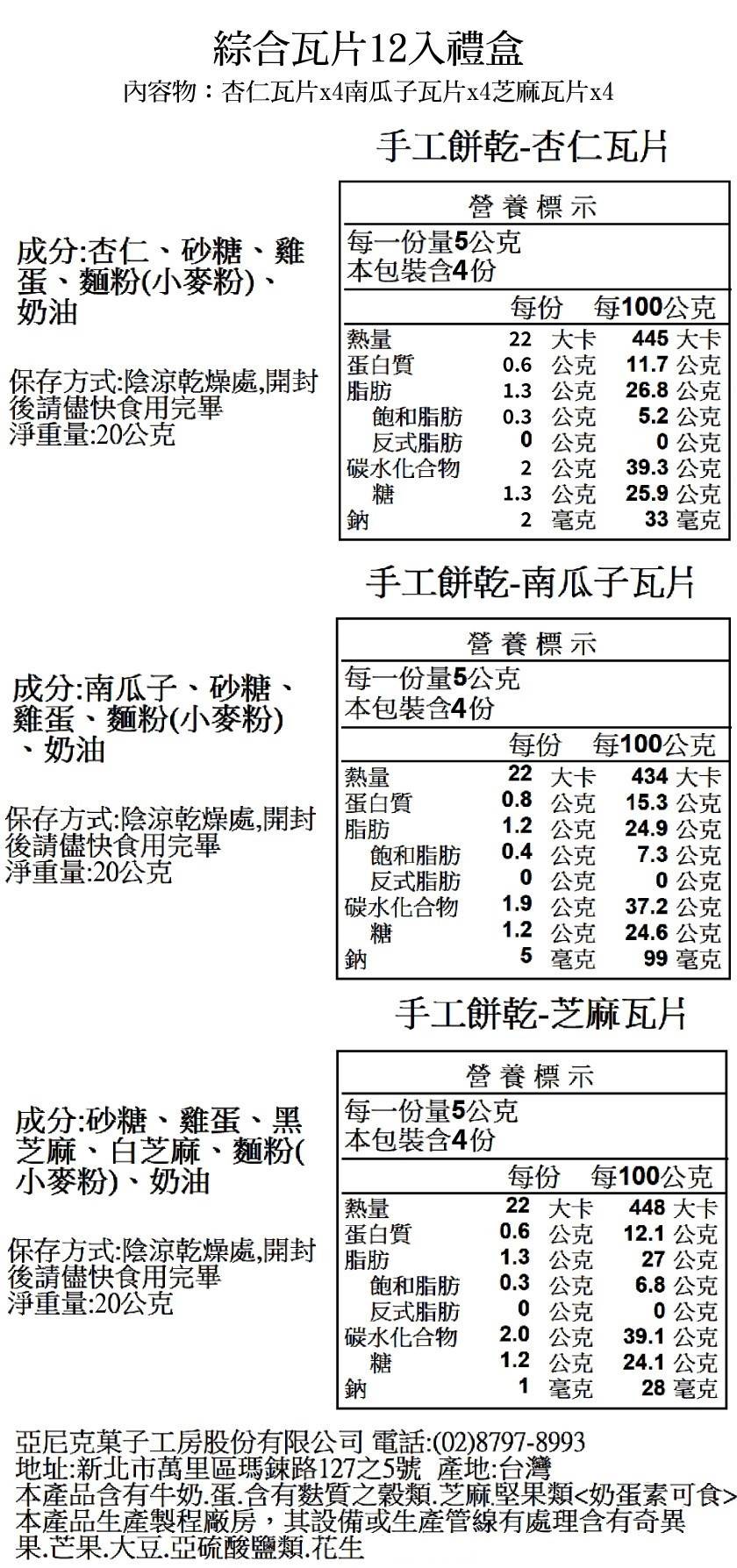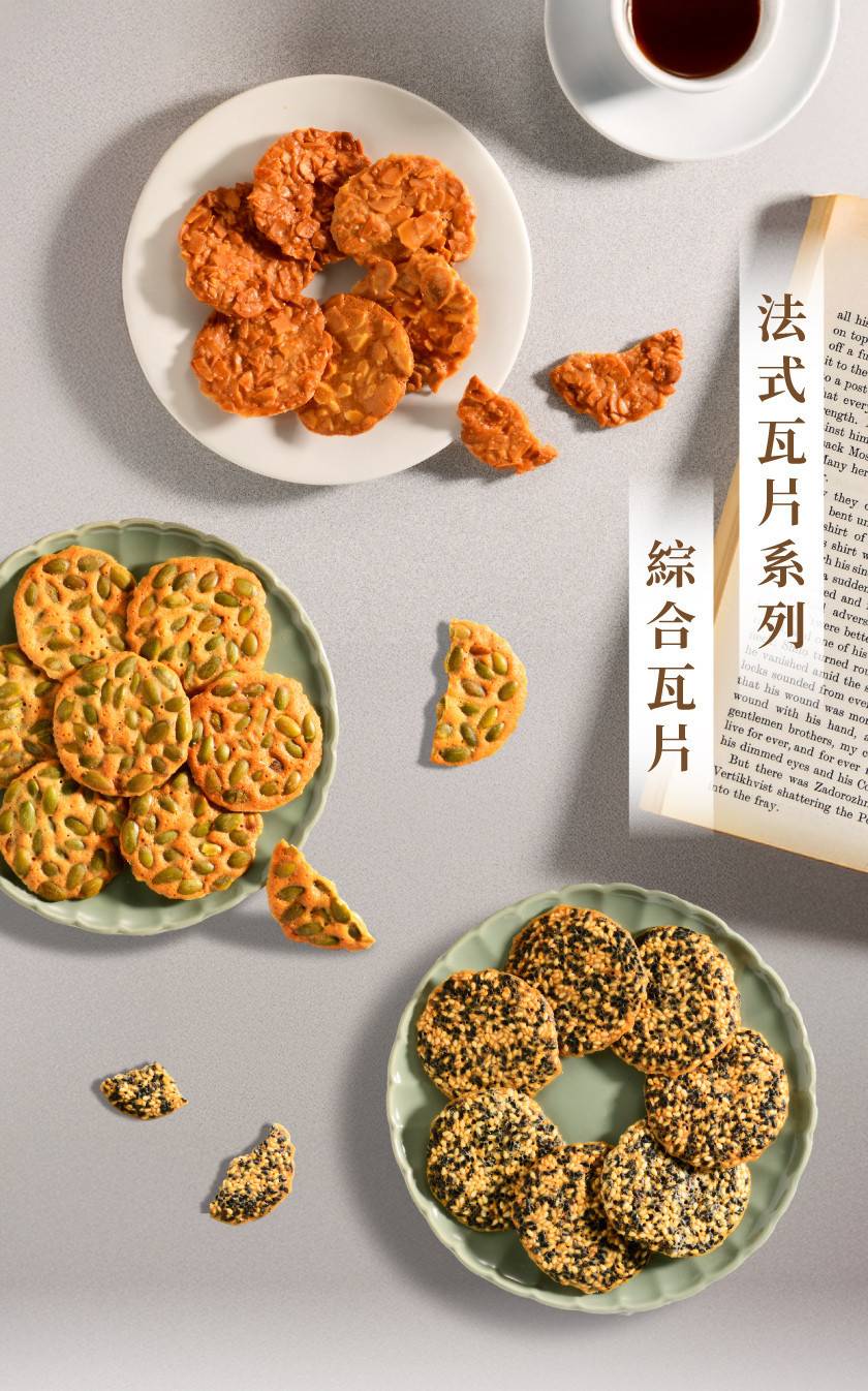 內容物:瓦片禮盒*3(杏仁瓦片*4+芝麻瓦片*4+南瓜籽瓦片*4/盒)+提袋*3