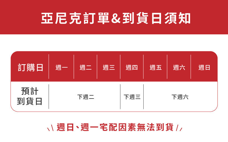 🔴下單後完成付款後,依到貨日須知所示(國定假日除外,不另行公告)