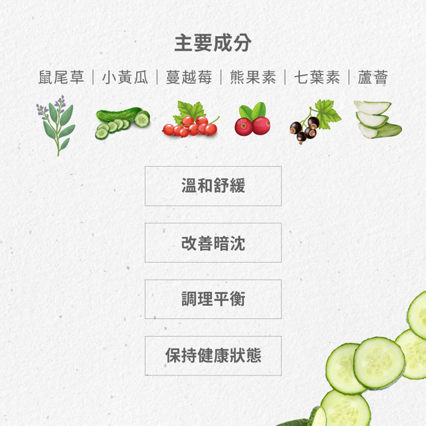 材質/成分:鼠尾草、小黃瓜、蔓越莓、熊果素、七葉素、蘆薈