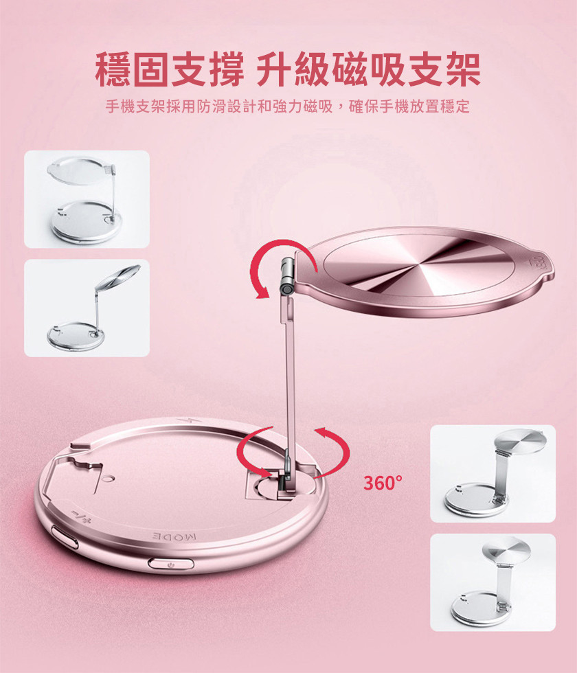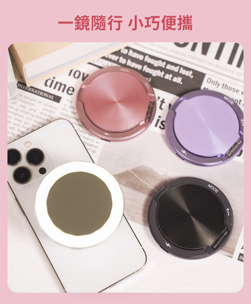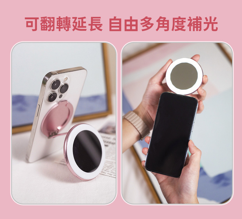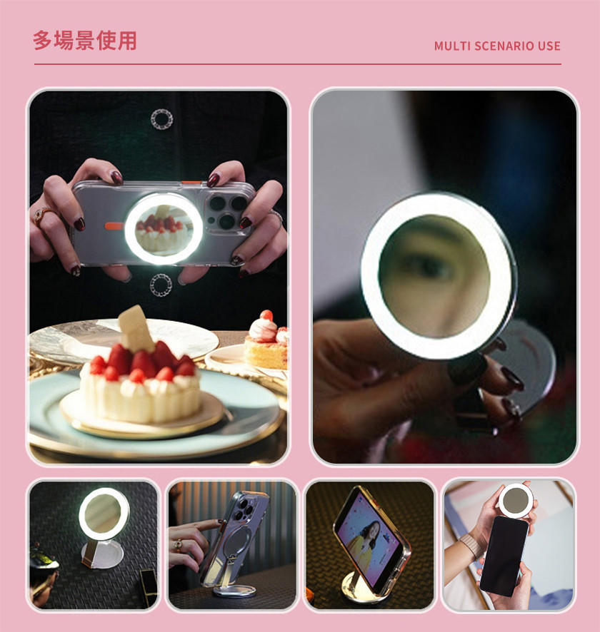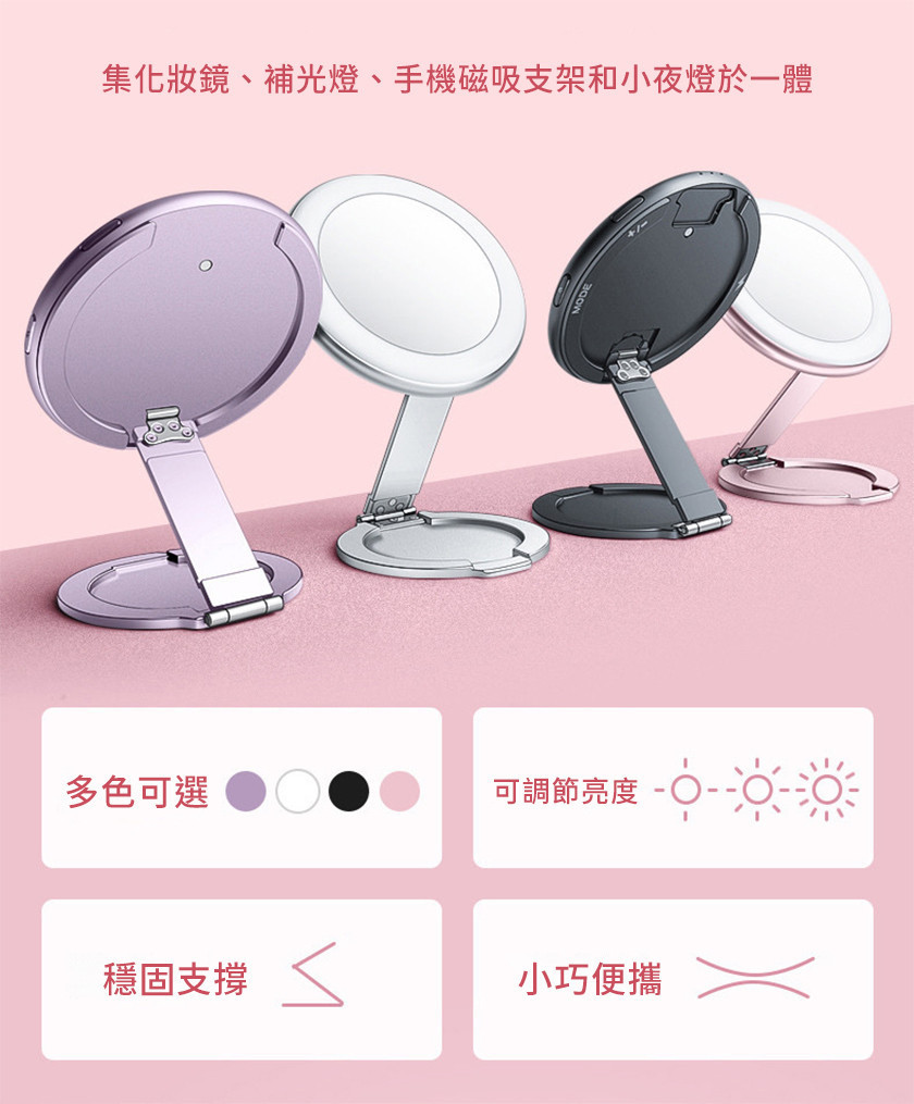 -4合1設計,集化妝鏡、補光燈、手機磁吸支架、小夜燈於一體