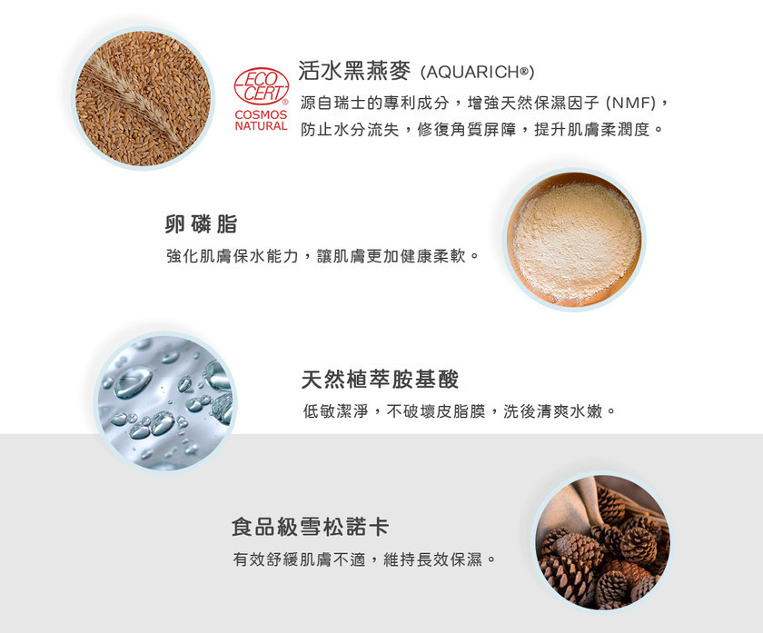 -富含活水黑燕麥萃取與甘油、Sodium PCA及甘油等保濕成分