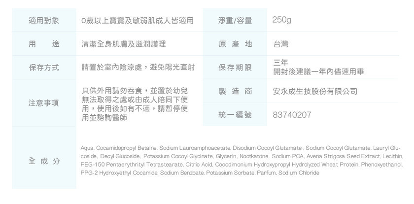 成分:Aqua、Cocamidopropyl Betaine、Sodium Lauroamphoacetate、Disodium Cocoyl Glutamate、Sodium Cocoyl Glutamate、 Lauryl Glucoside、Decyl Glucoside、Potassium Cocoyl Glycinate等。全成分詳見產品包裝標示