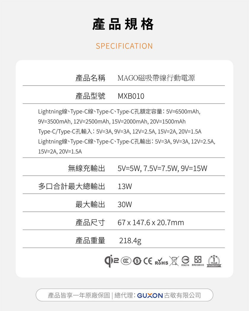 無線充輸出:5V⎓5W,7.5V⎓7.5W,9V⎓15W