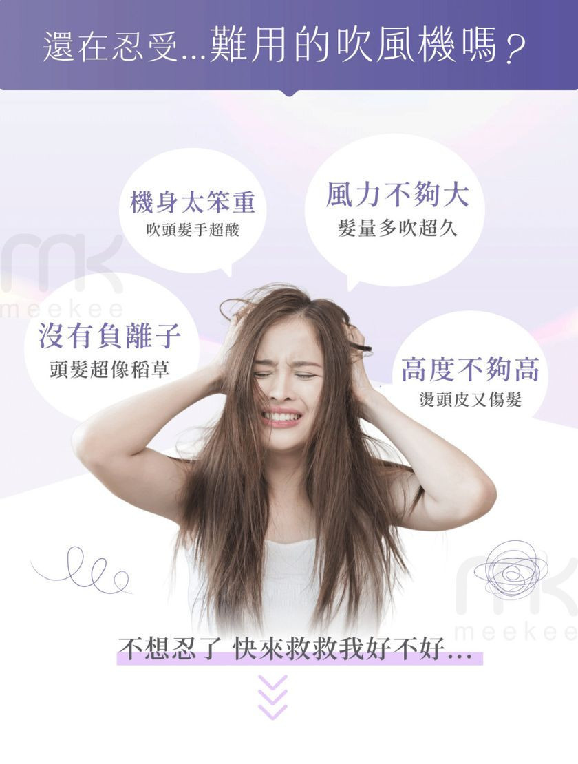 2.建議吹風角度約為30-60度,能避免頭髮被吸入
