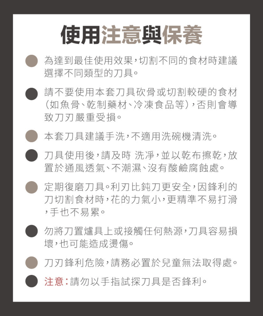 7.本套刀具建議手洗,不適用洗碗機淸洗