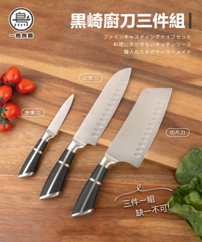 組合內容:一鳥 輕量黑崎廚刀3件組*1+一鳥 原木纖維防滑砧板*1