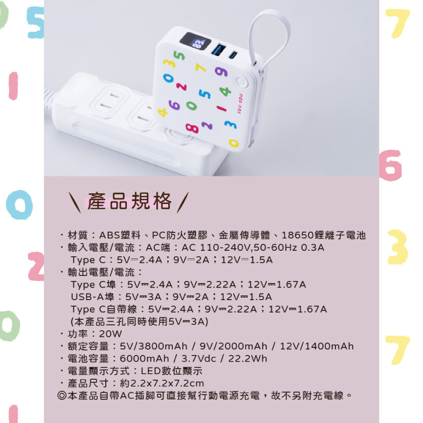 Type C自帶線:5V⎓2.4A;9V⎓2.22A;12V⎓1.67A