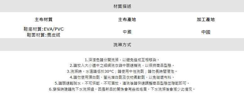 1. 洗滌時,水溫請低於30°C;請使用中性洗劑;請勿長時間浸泡。