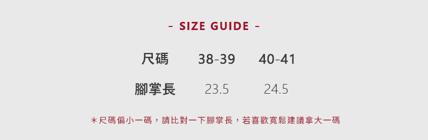 尺碼偏小一碼,請比對一下腳掌長,若喜歡寬鬆建議拿大一碼