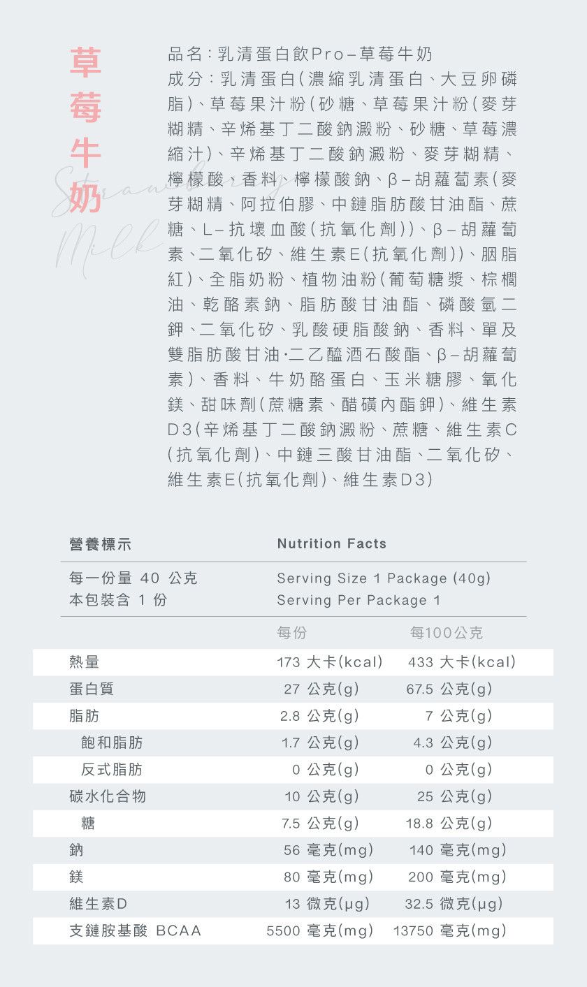 成分:乳清蛋白(濃縮乳清蛋白、大豆卵磷脂)、草莓果汁粉(砂糖、草莓果汁粉(麥芽糊精、辛烯基丁二酸鈉澱粉、砂糖、草莓濃縮汁)、辛烯基丁二酸鈉澱粉、麥芽糊精、檸檬酸·香料、檸檬酸鈉、B-胡蘿蔔素(麥芽糊精、阿拉伯膠、中鏈脂肪酸甘油酯、蔗糖、L-抗壞血酸(抗氧化劑))、B-胡蘿蔔素、二氧化矽、維生素E(抗氧化劑))、胭脂紅)、全脂奶粉、植物油粉(葡萄糖漿、棕櫚油、乾酪素鈉、脂肪酸甘油酯、磷酸氫二鉀、二氧化矽、乳酸硬脂酸鈉、香料、單及雙脂肪酸甘油·二乙醯酒石酸酯、B-胡蘿蔔素)、香料、牛奶酪蛋白、玉米糖膠、氧化鎂、甜味劑(蔗糖素、醋磺內酯鉀)、維生素D3(辛烯基丁二酸鈉澱粉、蔗糖、維生素C(抗氧化劑)、中鏈三酸甘油酯、二氧化矽、維生素E(抗氧化劑)、維生素D3)