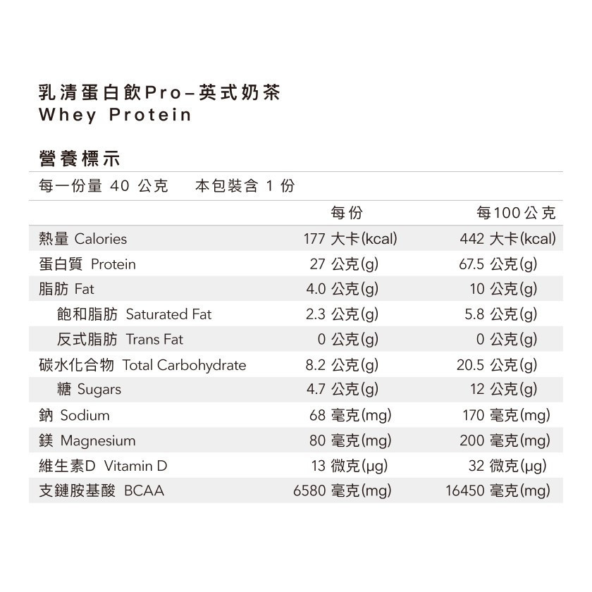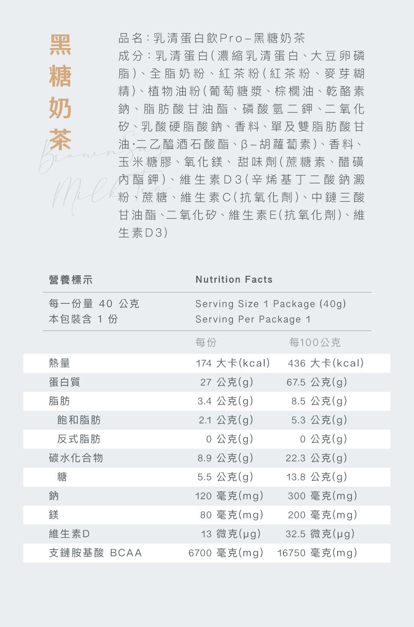 成分:乳清蛋白(濃縮乳清蛋白、大豆卵磷脂)、全脂奶粉、植物油粉(葡萄糖漿、棕櫚油、乾酪素鈉、脂肪酸甘油酯、磷酸氫二鉀、二氧化矽、乳酸硬脂酸鈉、香料、單及雙脂肪酸甘油‧二乙醯酒石酸酯、β-胡蘿蔔素)、紅茶粉、香料、氧化鎂、甜味劑(蔗糖素、醋磺內酯鉀)、維生素D3(辛烯基丁二酸鈉澱粉、蔗糖、維生素C(抗氧化劑)、中鏈三酸甘油酯、二氧化矽、維生素E(抗氧化劑)、維生素D3)