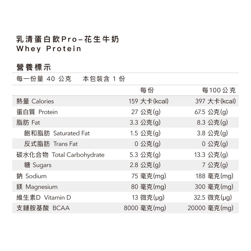 成分:乳清蛋白(濃縮乳清蛋白、大豆卵磷脂)、花生粉、全脂奶粉、香料、麥芽糊精、碳酸鈣、玉米糖膠、氧化鎂、卵磷脂、甜味劑(蔗糖素、醋磺內酯鉀)、維生素D3(辛烯基丁二酸鈉澱粉、蔗糖、維生素C(抗氧化劑)、中鏈三酸甘油酯、二氧化矽、維生素E(抗氧化劑)、維生素D3)