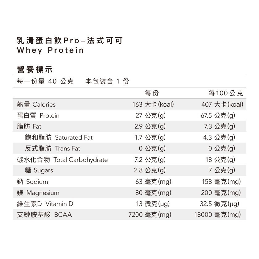 成分:乳清蛋白(濃縮乳清蛋白、大豆卵磷脂)、歐洲進口可可粉、全脂奶粉、植物油粉(葡萄糖漿、棕櫚油、乾酪素鈉、脂肪酸甘油酯、磷酸氫二鉀、二氧化矽、乳酸硬脂酸鈉、香料、單及雙脂肪酸甘油‧二乙醯酒石酸酯、β-胡蘿蔔素)、香料、玉米糖膠、甜味劑(蔗糖素、醋磺內酯鉀)、氧化鎂、維生素D3(辛烯基丁二酸鈉澱粉、蔗糖、維生素C(抗氧化劑)、中鏈三酸甘油酯、二氧化矽、維生素E(抗氧化劑)、維生素D3)