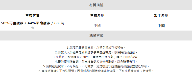 成分:50%再生纖維 / 44%聚酯纖維 / 6%萊卡
