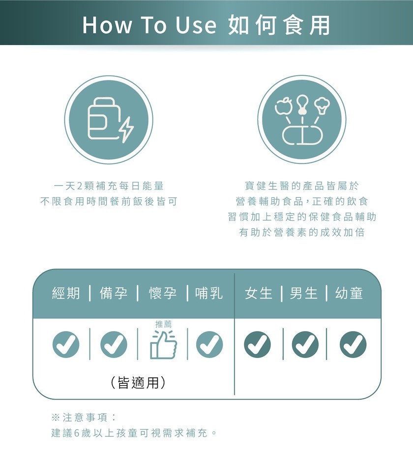 食用方式:每日2顆,建議飯後食用,吸收度較佳,多食無益