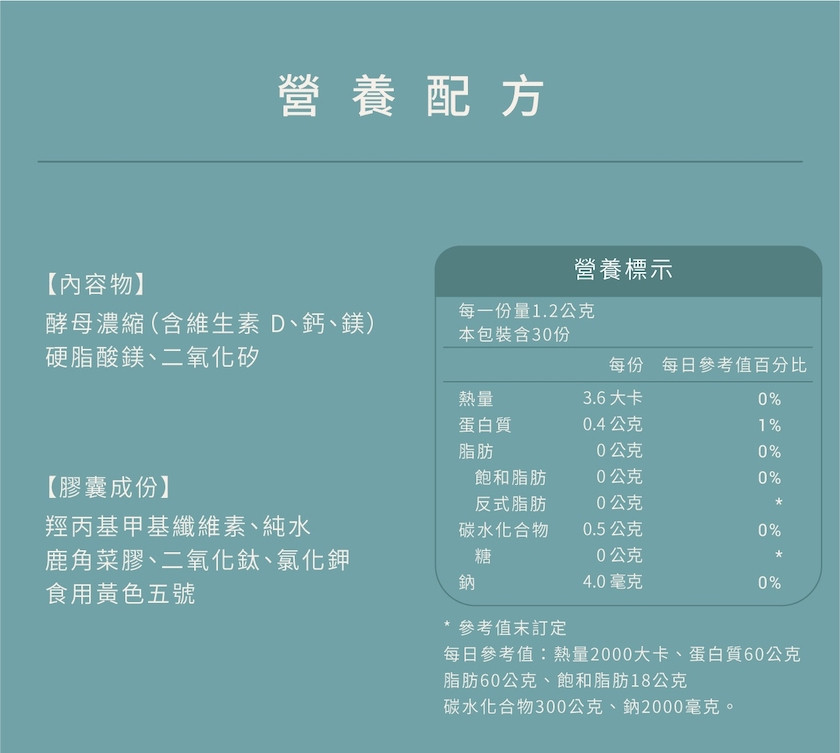 成分:酵母濃縮(含維生素 D、鈣、鎂)、硬脂酸鎂、二氧化矽
