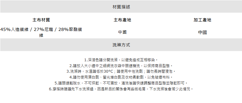 成分:45%人造纖維 / 27%尼龍 / 28%聚酯纖維