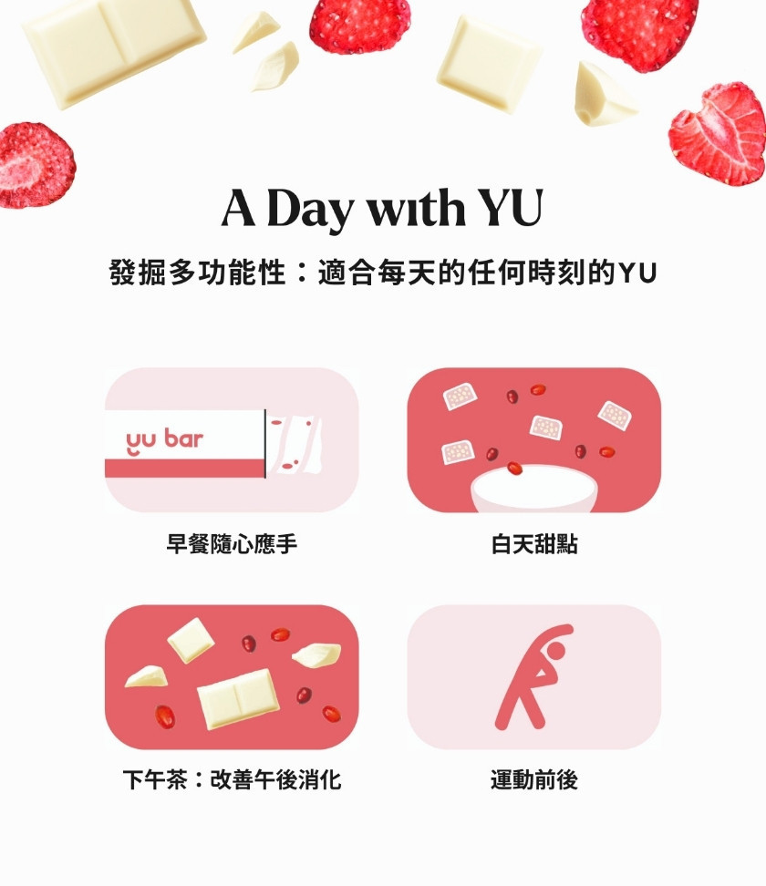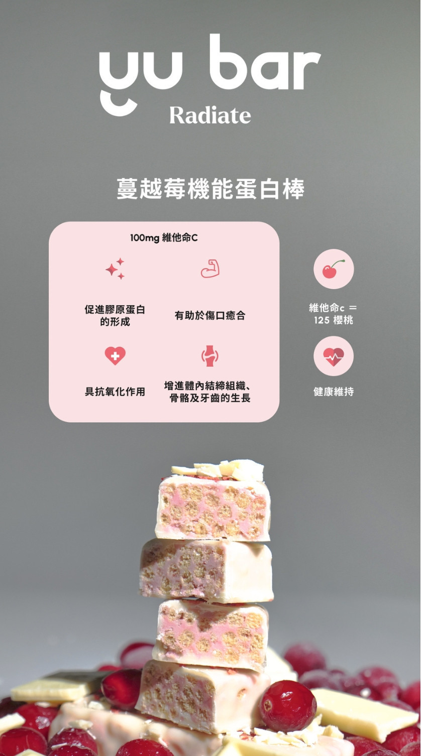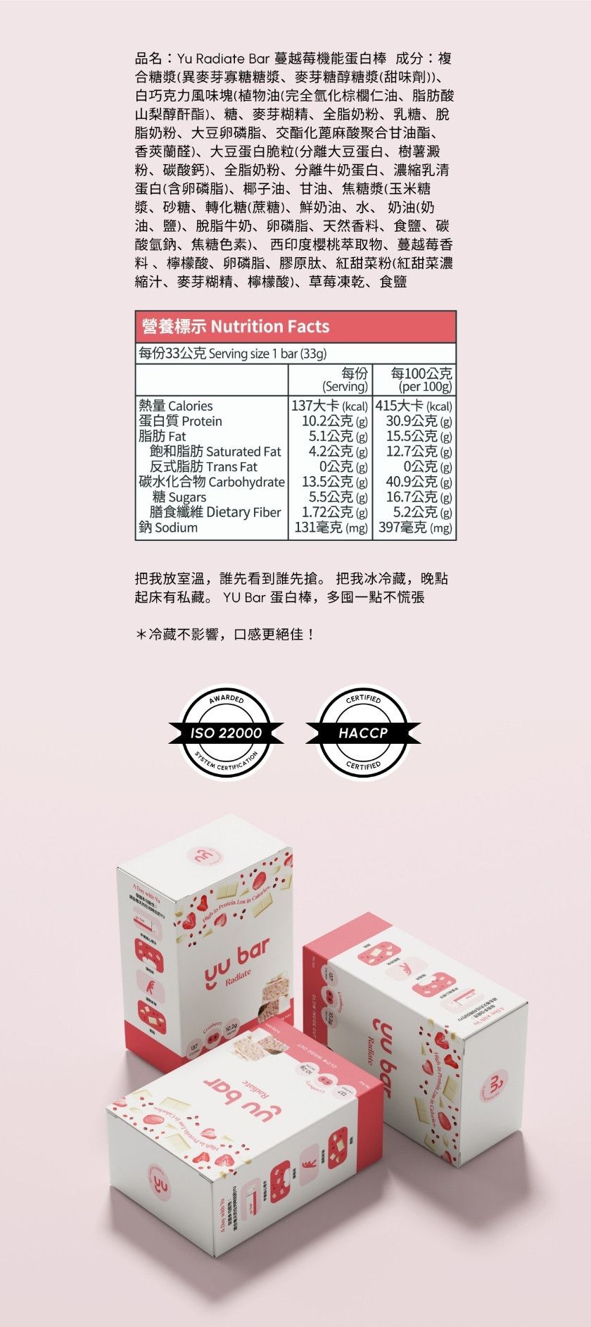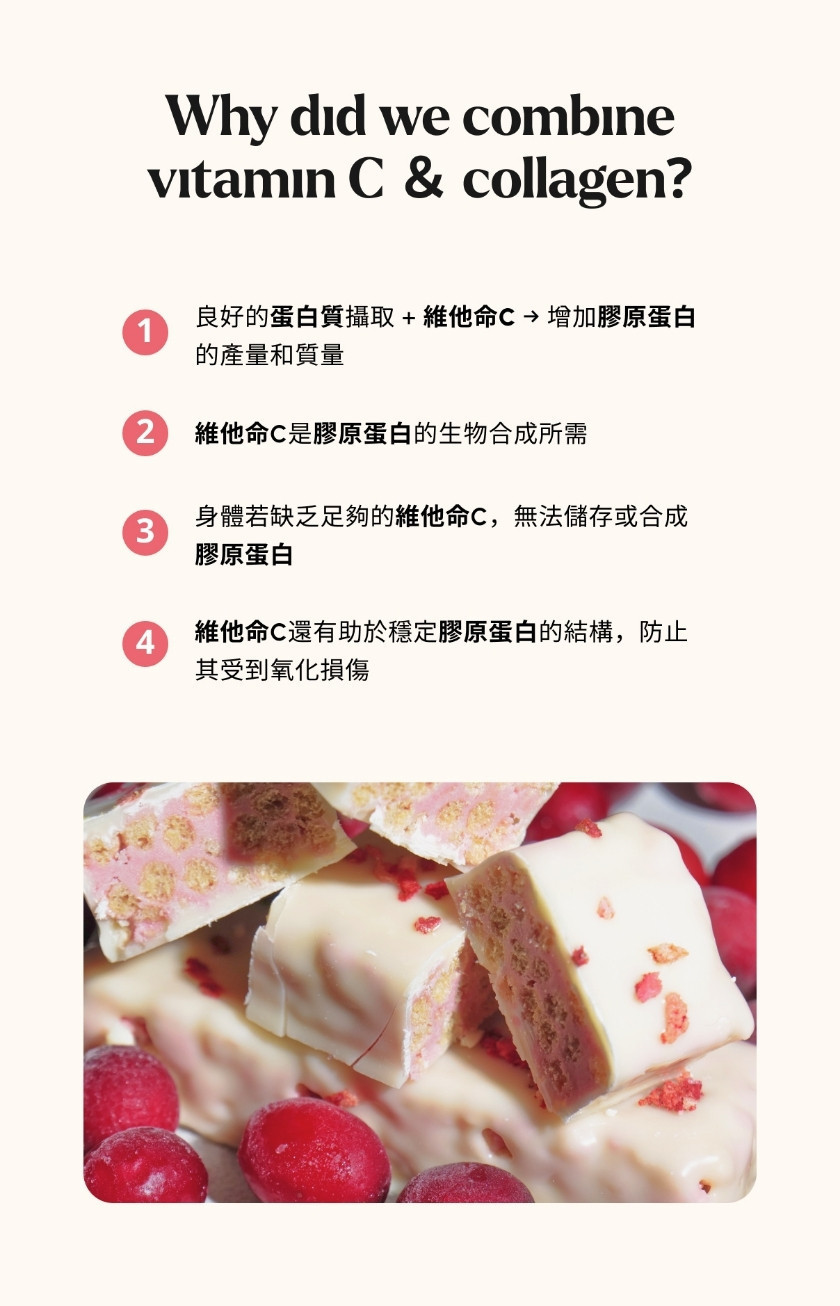 成分:複合糖漿(異麥芽寡糖糖漿、麥芽糖醇糖漿(甜味劑))、白巧克力風味塊(植物油(完全氫化棕櫚仁油、脂肪酸山梨醇酐酯)、糖、麥芽糊精、全脂奶粉、乳糖、脫脂 奶粉、大豆卵磷脂、交酯化蓖麻酸聚合甘油酯、香莢蘭醛)、大豆蛋白脆粒(分離大豆蛋白、樹薯澱粉、碳酸鈣)、全脂奶粉、分離牛奶蛋白、濃縮乳清蛋白(含卵磷脂)、椰子油、甘油、焦糖漿(玉米糖漿、砂糖、轉化糖(蔗糖)、鮮奶油、水、 奶油(奶油、鹽)、脫脂牛奶、卵磷脂、天然香料、食鹽、碳酸氫鈉、焦糖色素)、 西印度櫻桃萃取物、蔓越莓香料 、檸檬酸、卵磷脂、膠原胜肽、紅甜菜粉(紅甜菜濃縮汁、麥芽糊精、檸檬酸)、草莓凍乾、食鹽