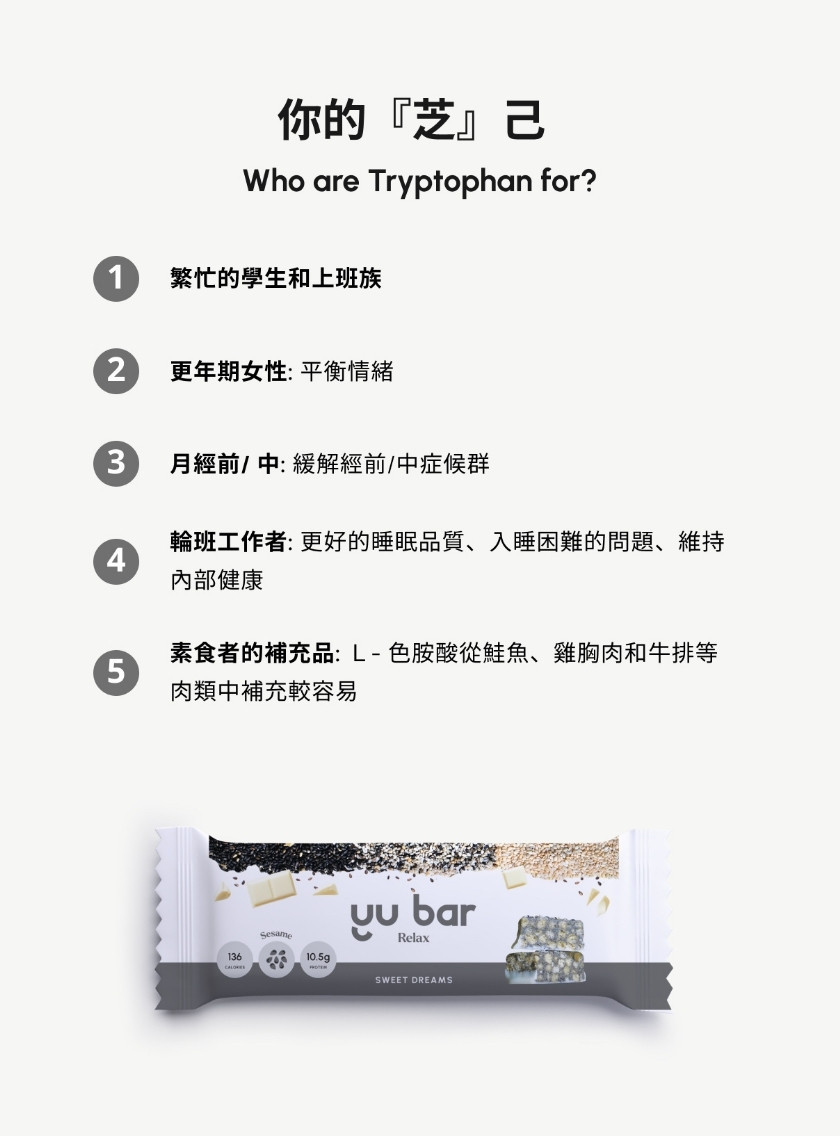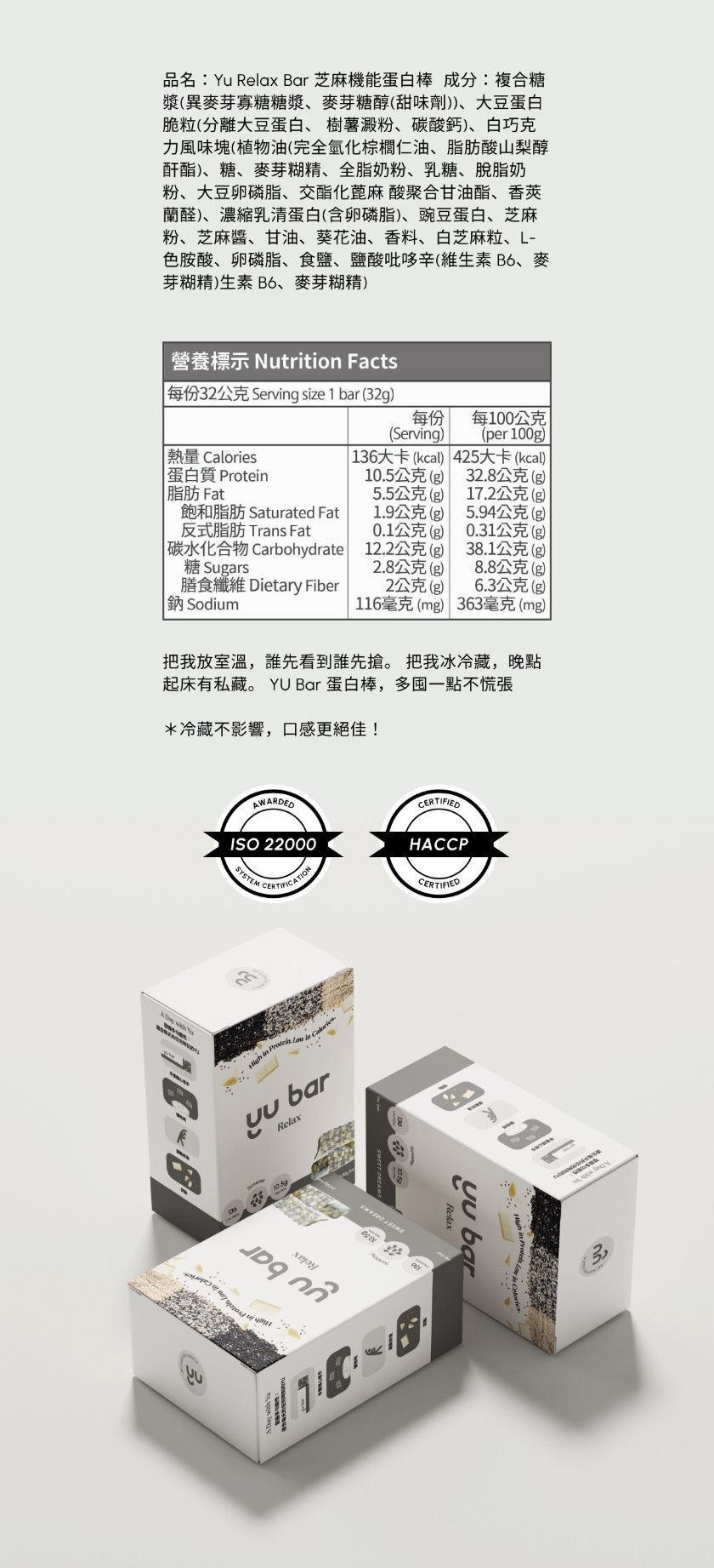 成分:複合糖漿(異麥芽寡糖糖漿、麥芽糖醇(甜味劑))、大豆蛋白脆粒(分離大豆蛋白、 樹薯澱粉、碳酸鈣)、白巧克力風味塊(植物油(完全氫化棕櫚仁油、脂肪酸山梨醇 酐酯)、糖、麥芽糊精、全脂奶粉、乳糖、脫脂奶粉、大豆卵磷脂、交酯化蓖麻 酸聚合甘油酯、香莢蘭醛)、濃縮乳清蛋白(含卵磷脂)、豌豆蛋白、芝麻粉、芝麻醬、甘油、葵花油、香料、白芝麻粒、L-色胺酸、卵磷脂、食鹽、鹽酸吡哆辛(維生素B6、麥芽糊精)