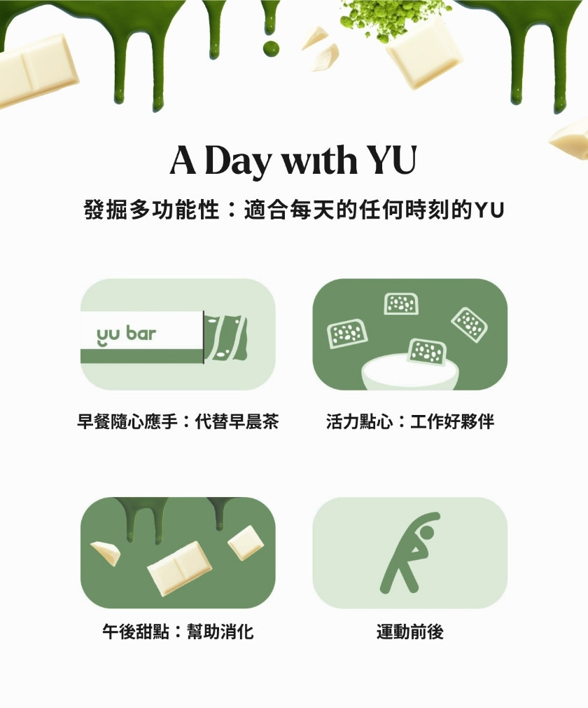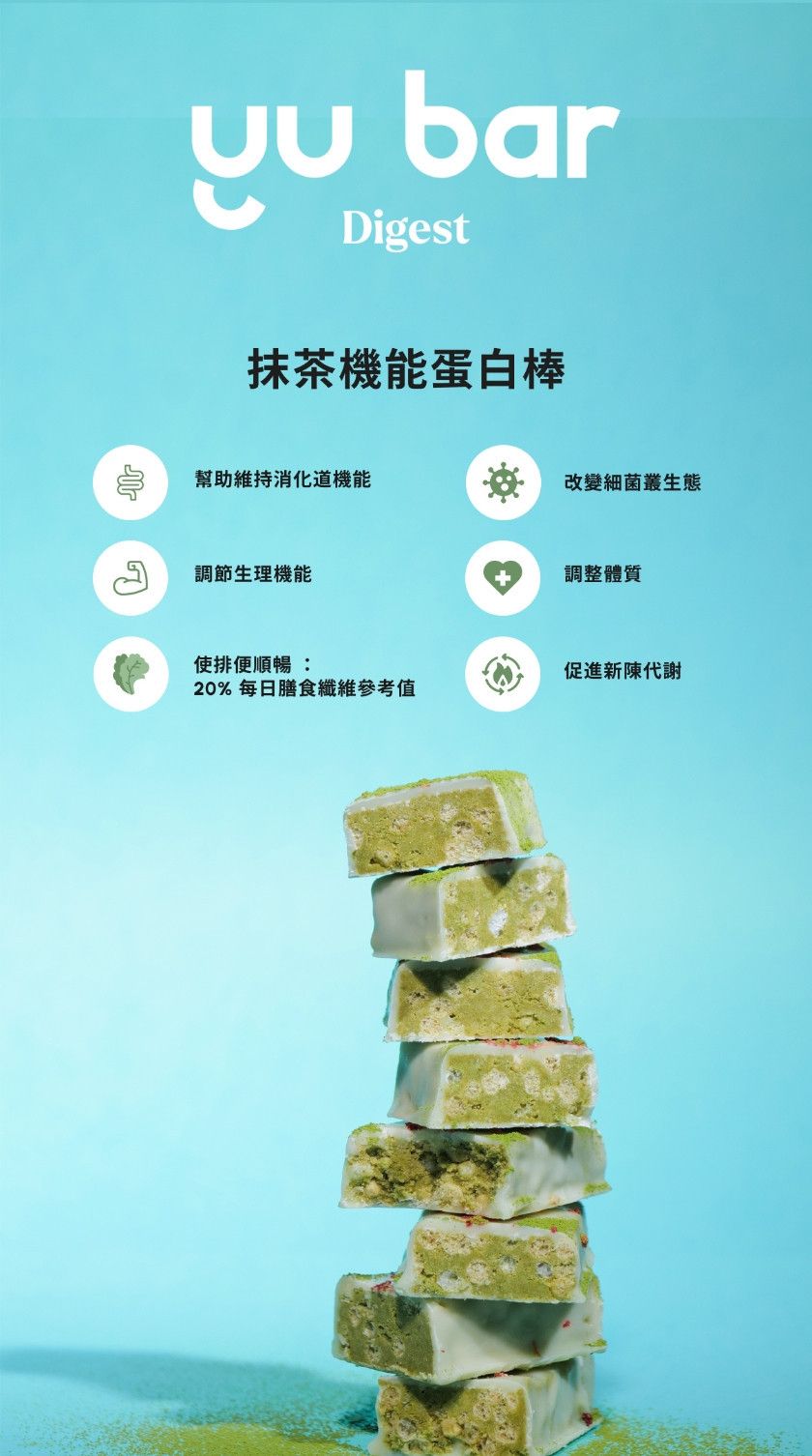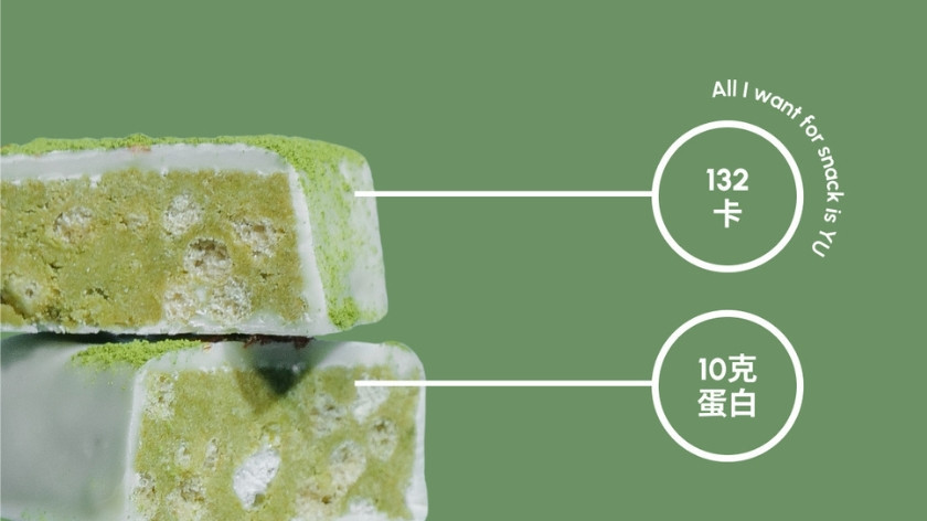 成分:複合糖漿(菊糖糖漿、異麥芽寡糖糖漿、麥芽糖醇(甜味劑))、白巧克力風味塊(植物油(完全氫化棕櫚仁油、脂肪酸山梨醇酐酯)、糖、麥芽糊精、全脂奶粉、乳糖、 脫脂奶粉、大豆卵磷脂、交酯化蓖麻酸聚合甘油酯、香莢蘭醛)、分離牛奶蛋白、大豆蛋白脆粒(分離大豆蛋白、樹薯澱粉、碳酸鈣)、甘油、濃縮乳清蛋白(含卵磷脂)、椰子油、啤酒酵母、菊苣纖維、抹茶粉、分離乳清蛋白、香料、糙米球(糙米)、綠茶萃取物、難消化麥芽糊精、卵磷脂、草莓凍乾