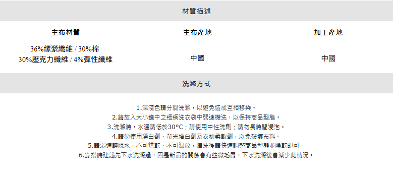 主布材質:36%縲縈纖維 / 30%棉 / 30%壓克力纖維 / 4%彈性纖維