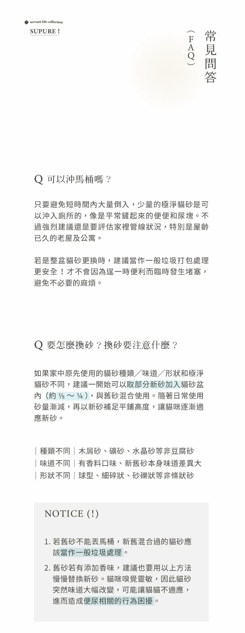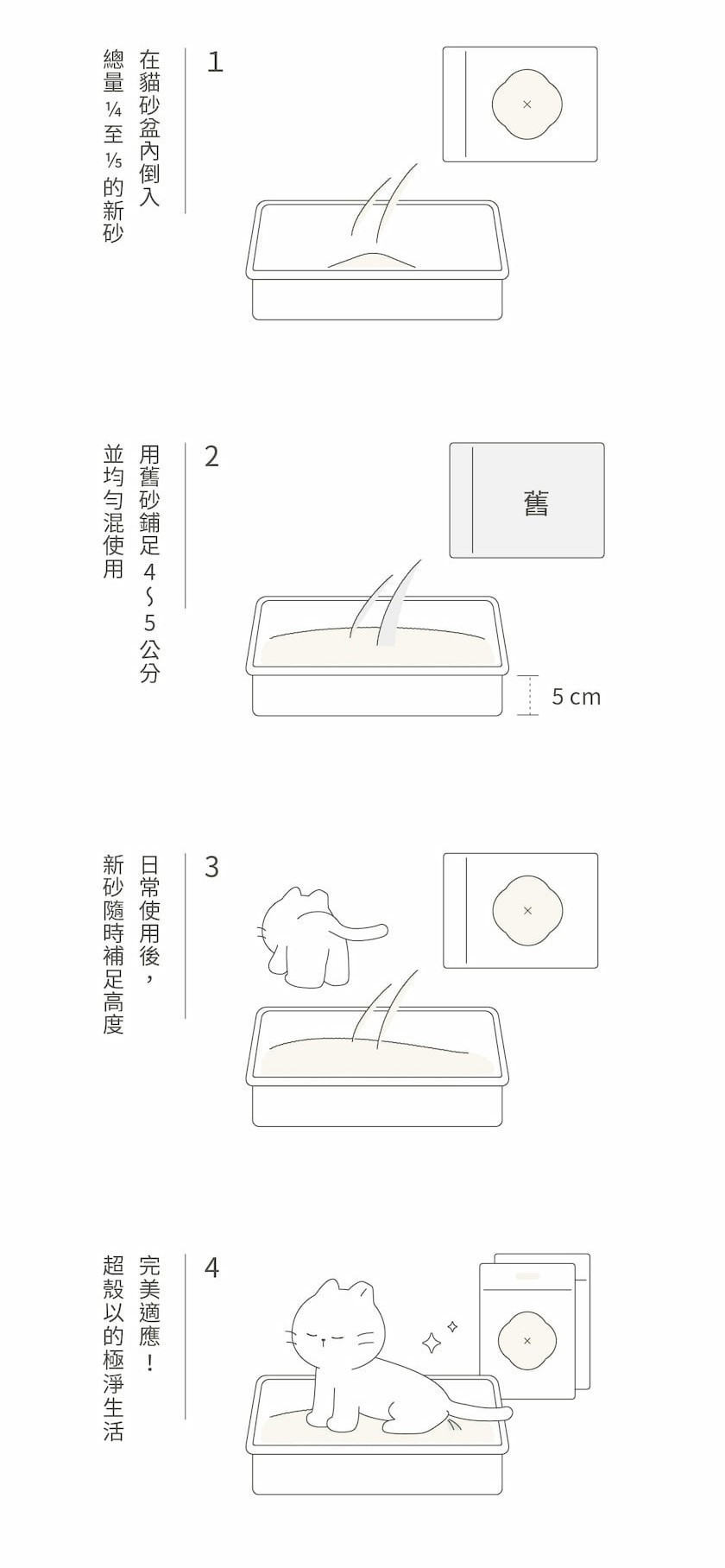 1.第1次使用極淨貓砂,可取少量極淨貓砂與原本使用的貓砂混合,待貓咪習慣後再逐漸增加用量讓貓貓輕鬆適應廁所