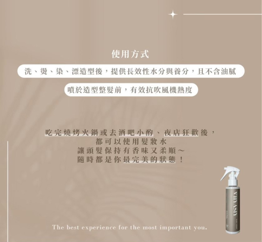 -可作為吹整造型前的保養噴霧,減少熱造型對髮絲的傷害感受