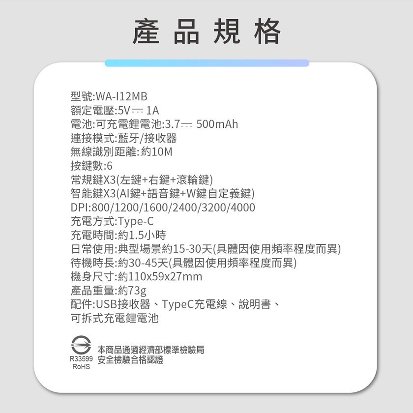 配件:TypeC充電線*1+說明書*1+可拆式充電離電池*1(放置滑鼠內)+USB接收器*1(放置滑鼠內)