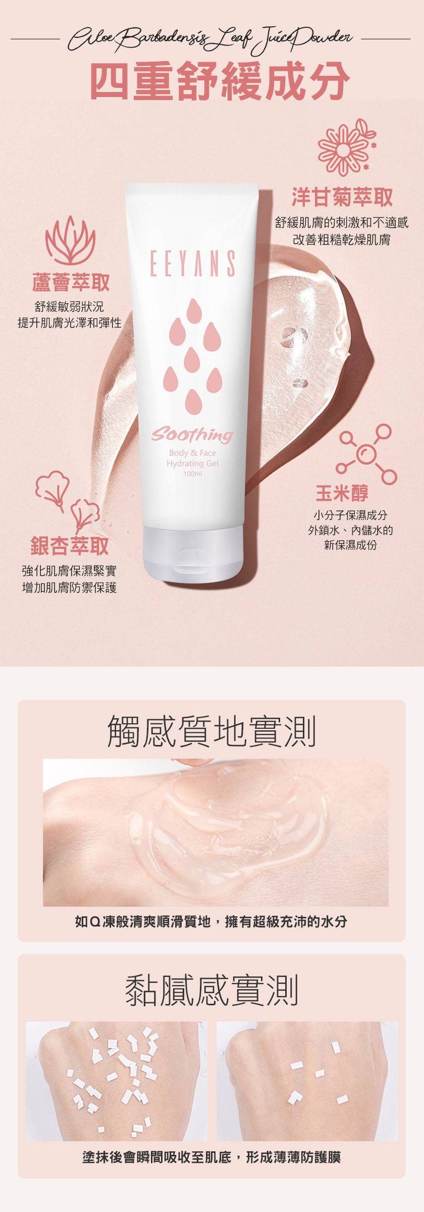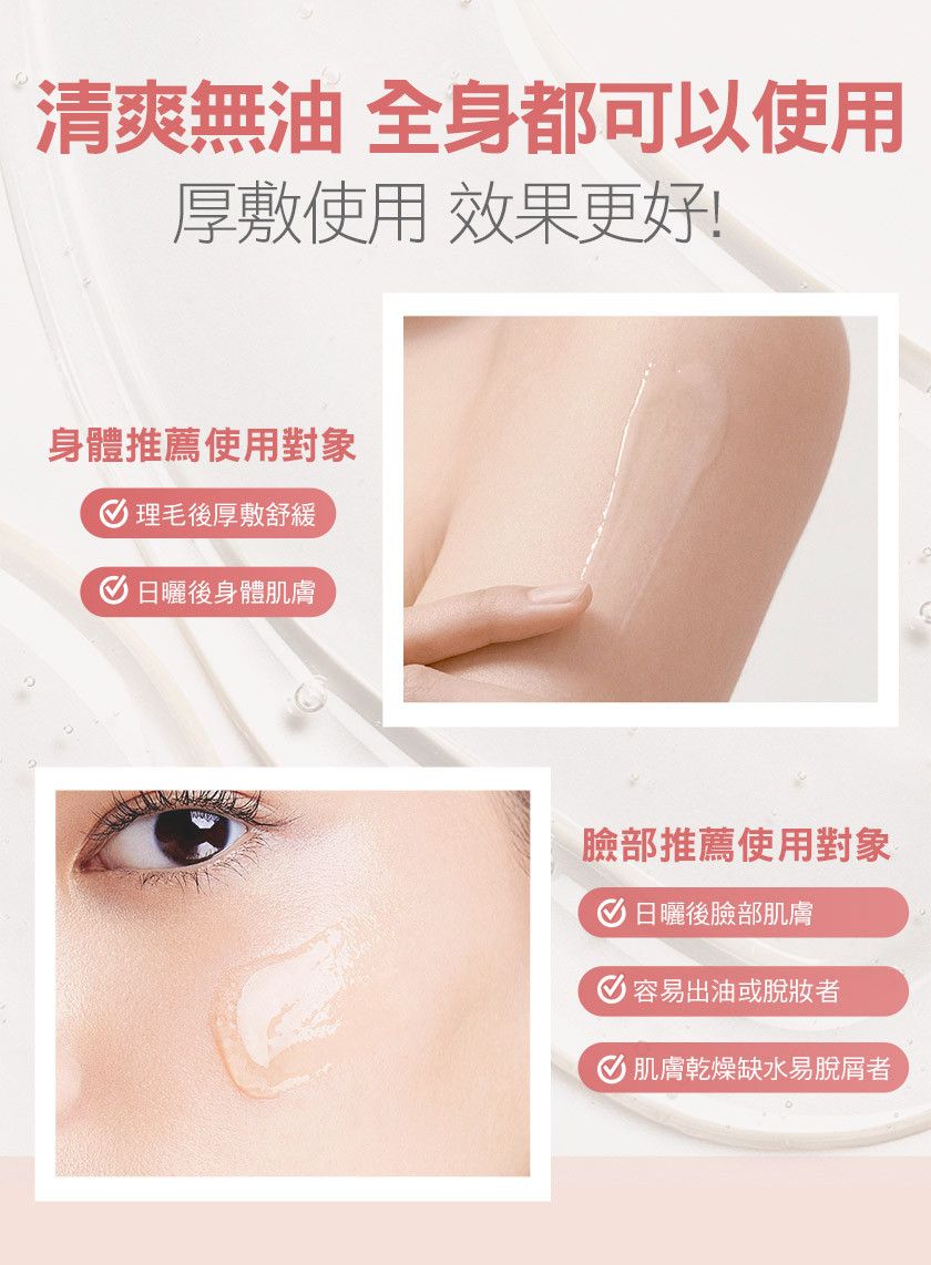 成分:Water、Glycerin、Propanediol、Acrylates/C10-30 Alkyl Acrylate Crosspolymer、Diisopropanolamine、Chlorphenesin、Aloe Barbadensis Leaf Juice、Disodium EDTA等。全成分詳見產品包裝標示