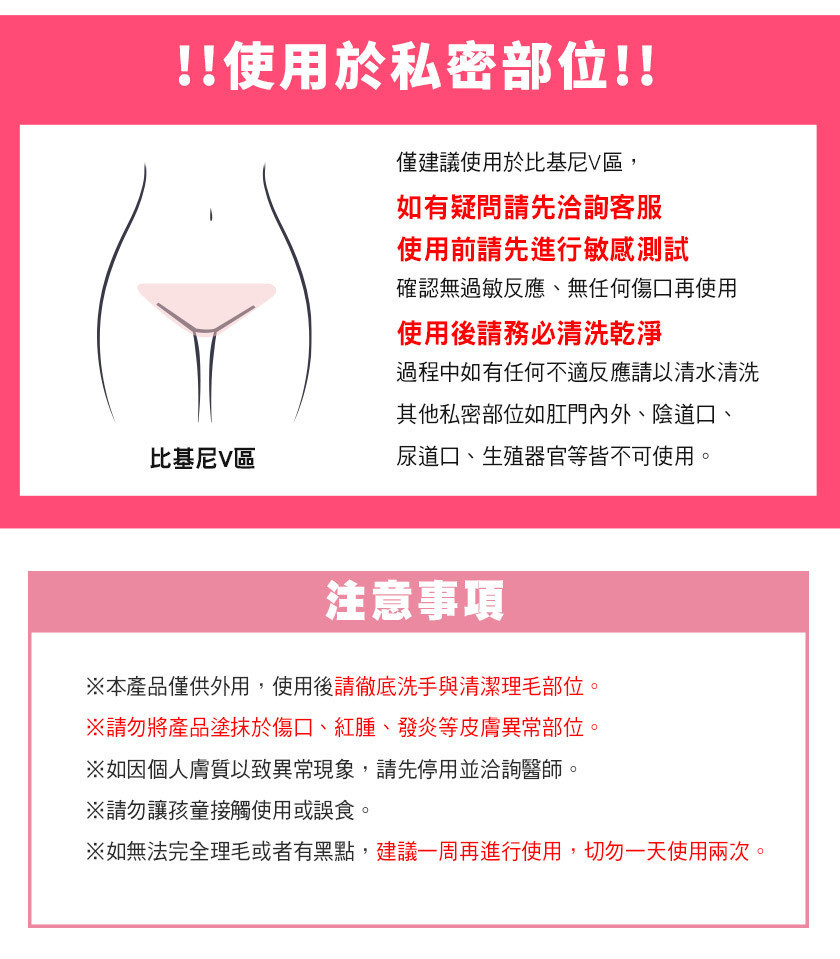 7.私密部位僅建議使用於比基尼V區,使用後請務必清洗乾淨,其他部位如肛門內外、陰道口、尿道口、生殖器管等皆不可使用